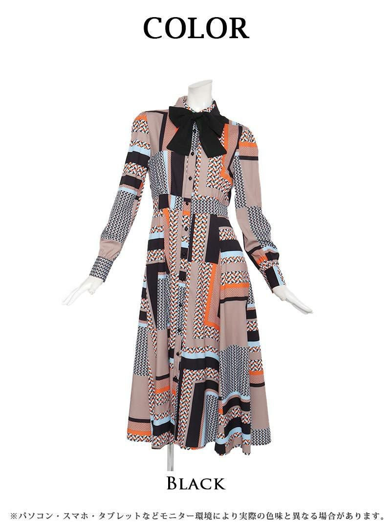 4. レトロジオメトリック柄ボウタイ長袖ロング韓国キャバクラワンピース【DaysPiece】(S/M/L/XL)(ブラック)