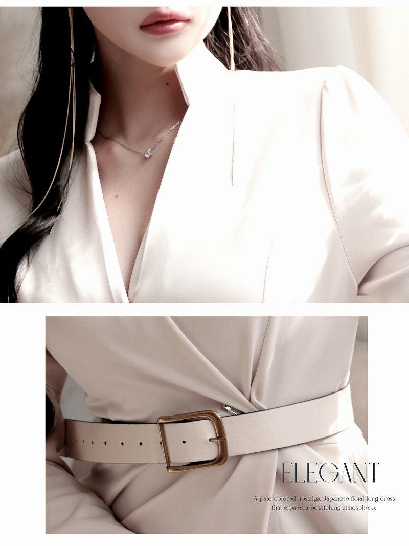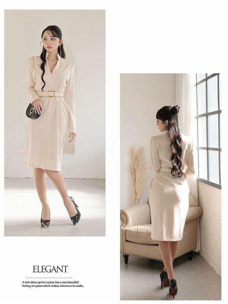 韓国風カシュクール長袖膝丈ワンピース 大人セレブなキャバドレス ベルト付き 【DaysPiece】
