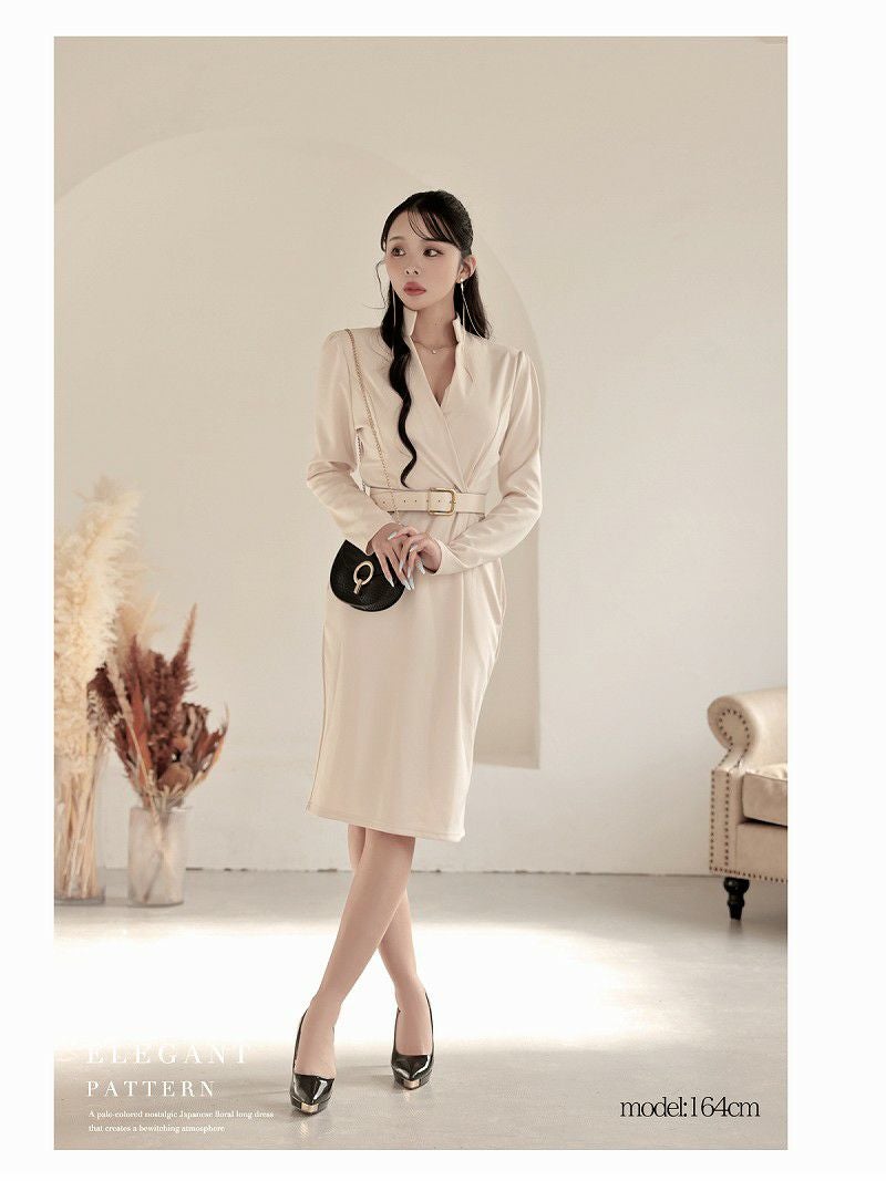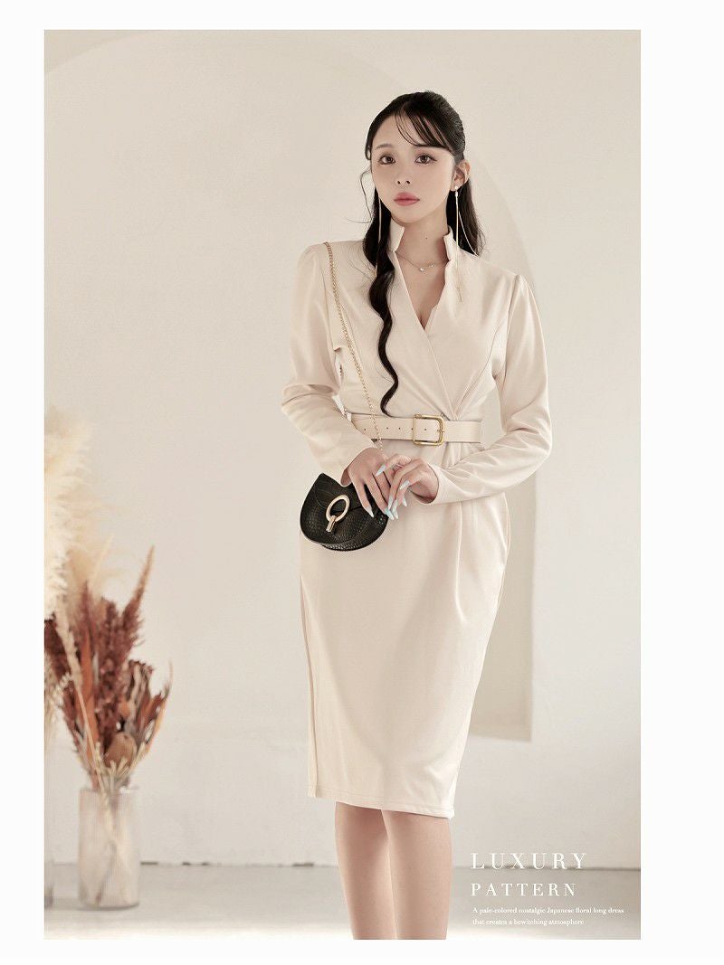 小顔効果抜群のスタンドカラーと上質素材で魅せる大人セレブな韓国風膝丈ワンピース。 先行予約割¥7280→¥6916!※一部予約販売※韓国風カシュクール長袖膝丈ワンピース 大人セレブなキャバドレス ベルト付き KANO 着用 キャバワンピース【DaysPiece】(S/M/L/XL(2L)/XXL(3L))(ベージュ/ホワイト/ブラック)?ptpl