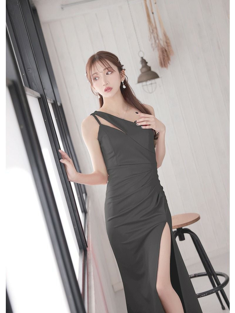 シンプルなのに高見え、差がつくワンショルデザイン 先行予約割¥3980→¥3781!※一部予約販売※アシンメトリーショルダータイト美ラインキャバロングドレス あいさ 着用 キャバドレス【RyuyuChick】(S/M/L)(ブラック/ホワイト)