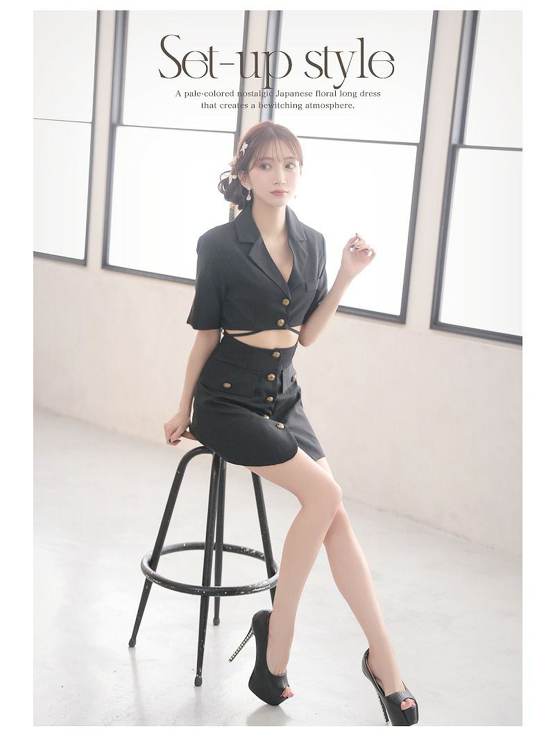 お腹の下に見える2本のラインでデザイン性あるセットアップはトレンドキャバクラスーツとしてバッチリ。
