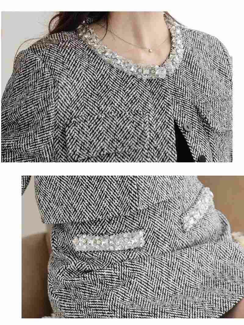7. 上質厚手ツイード首元ビジューノーカラージャケット&ミニスカートセットアップ冬スーツ 加賀美早紀 着用キャバスーツ【BelsiaLUX】(S/M/L/XL(2L))(ブラック)