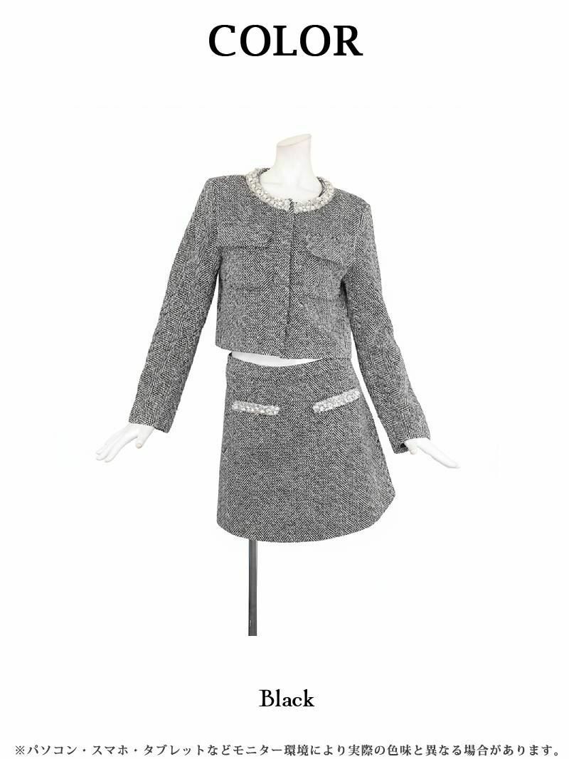 4. 上質厚手ツイード首元ビジューノーカラージャケット&ミニスカートセットアップ冬スーツ 加賀美早紀 着用キャバスーツ【BelsiaLUX】(S/M/L/XL(2L))(ブラック)
