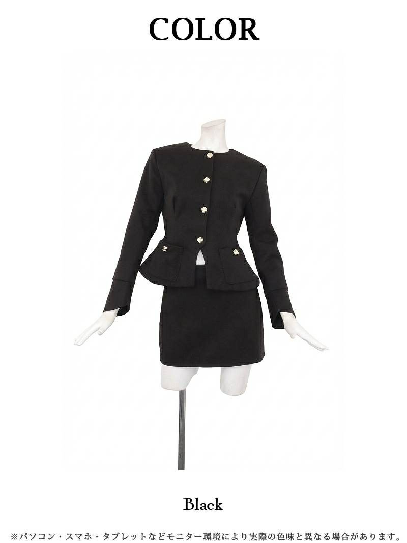 スタイルアップが叶う、ペプラムデザインの上品ノーカラーセットアップスーツ。 ノーカラーペプラムジャケット&ミニスカートセットアップスーツ【Ryuyu】(S/M/L/XL(2L))(ブラック)