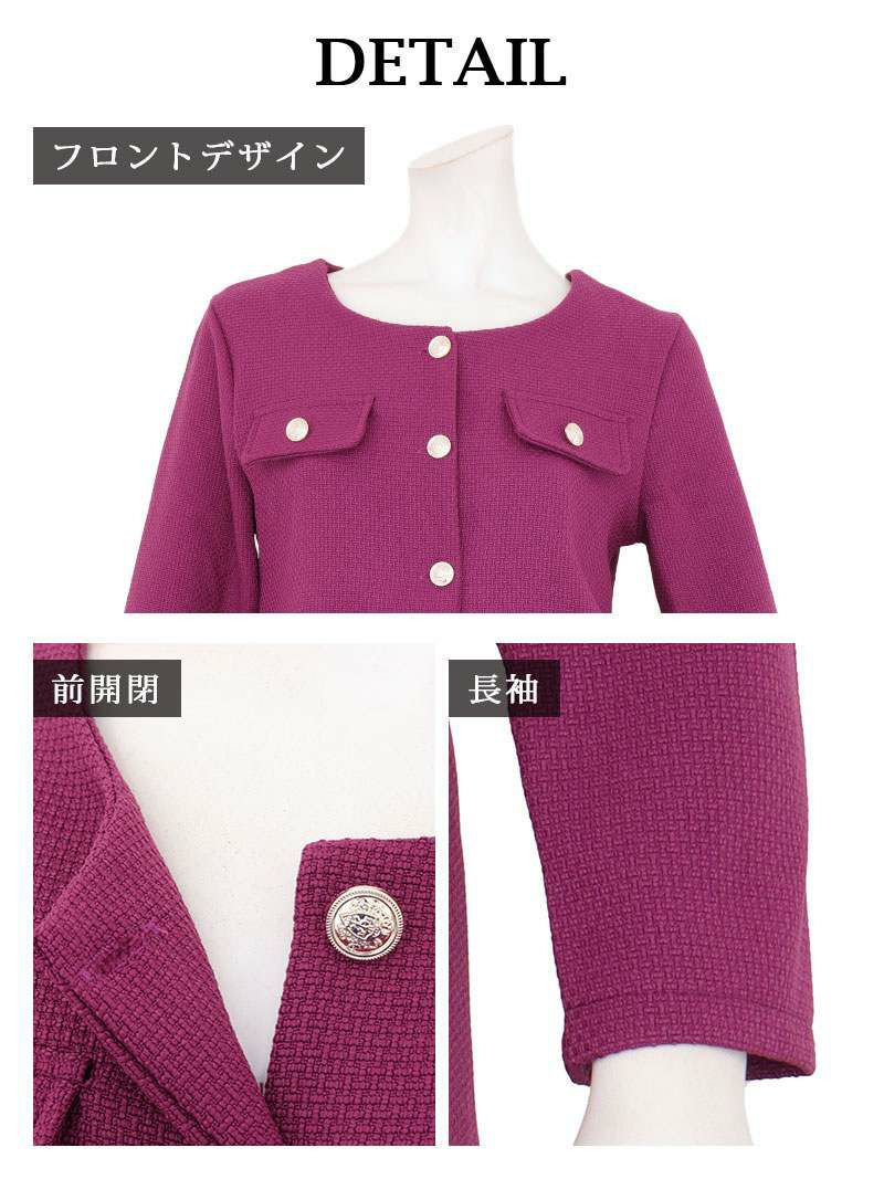 ゴールドボタンが高級感を添える、気品溢れる大人レディなツイードセットアップ ゴールドボタンが映えるノーカラーツイード長袖セットアップスーツ 加賀美早紀 着用 レディーススーツ【Belsia】(M/L/XL(2L)/XXL(3L))(パープル/ブラック)