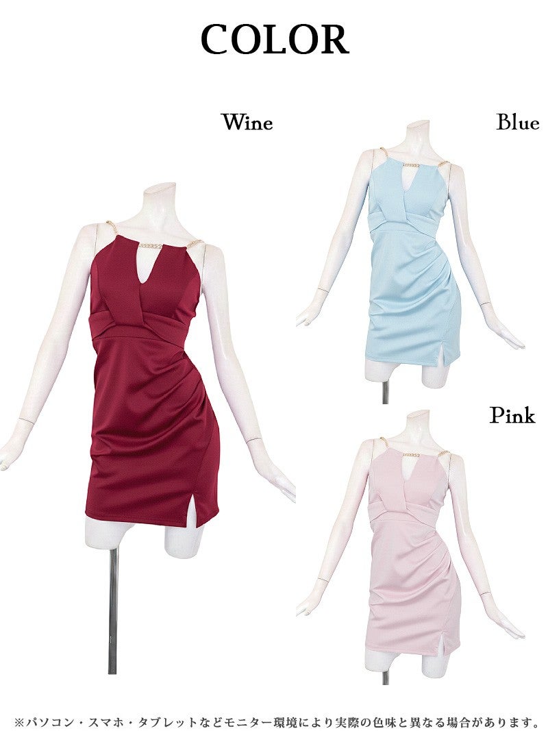 煌めくゴールドチェーンとバストカットで、周囲の視線を独占する色っぽ美シルエット。 先行予約割¥6980→¥6630!※一部予約販売※チェーンホルターのアメスリデザインがデコルテを綺麗に見せる、サイドギャザー入りのセクシーなバスト盛りミニドレス 【Ryuyu】(S/M/L/XL(2L))(ワイン/ピンク/ブルー)