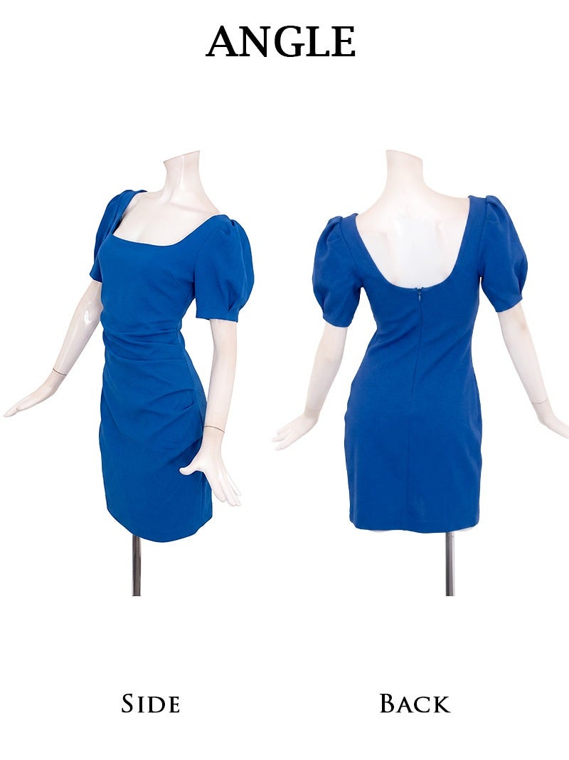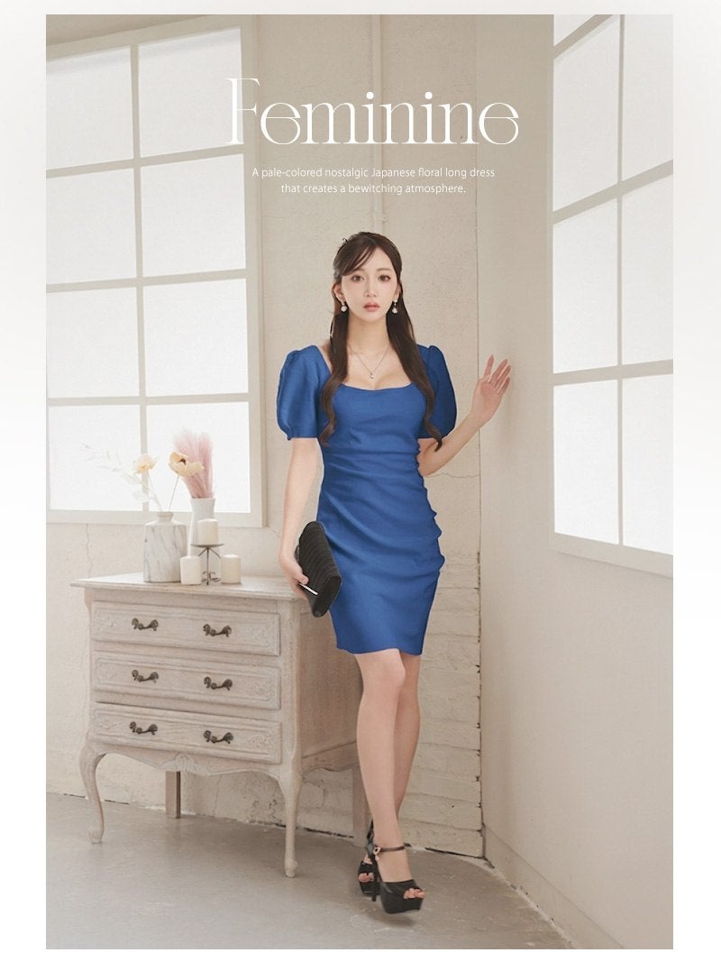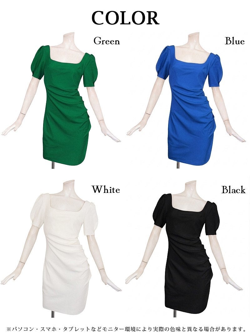 スクエアネックで鎖骨見せ、サイドギャザーでお腹周りの体型カバー! 先行予約割¥6980→¥6630!※一部予約販売※サイドギャザーで体型カバーを叶えつつ肉厚上質な素材が心地よくフィットするパフ袖タイトキャバワンピース 【Ryuyu】(S/M/L)(ブルー/ブラック/グリーン/ホワイト)