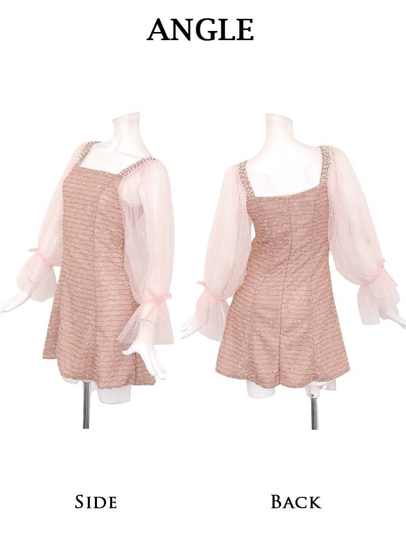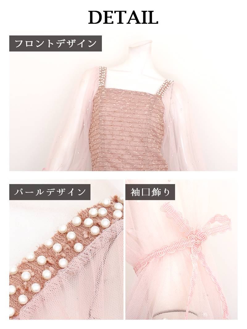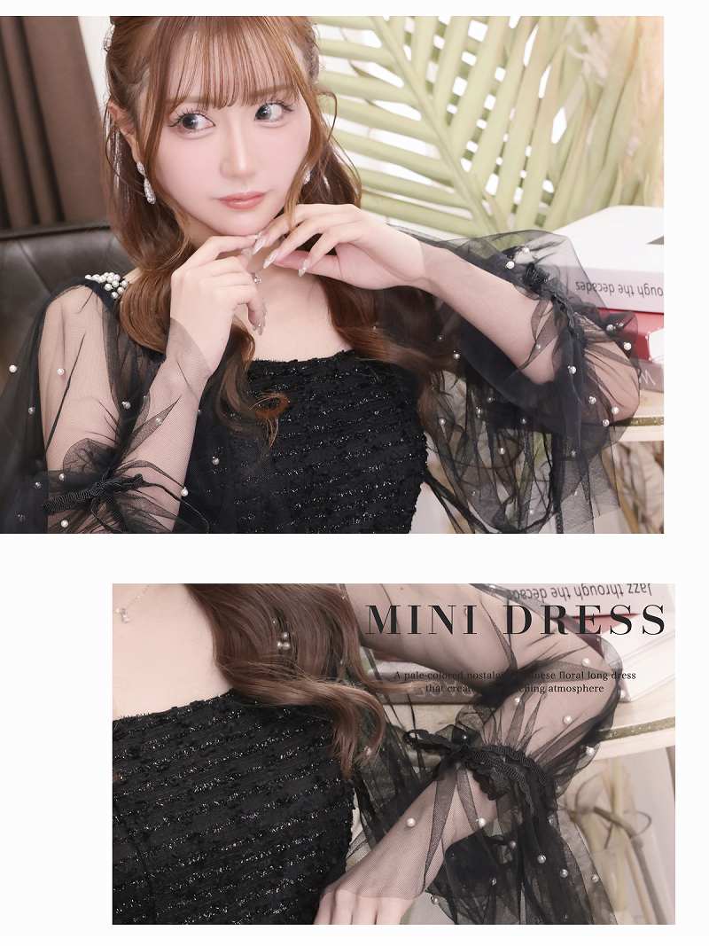 パールの甘さとシアーな透け感で、周囲を虜にするあざと可愛いミニドレス。 先行予約割¥4980→¥4731!※一部予約販売※パールを散りばめたシアー袖が可愛いラメ入りモールツイードフレアミニドレス りせり 着用 キャバドレス【RyuyuChick】(S/M/L/XL(2L))(ブラック/ピンク)