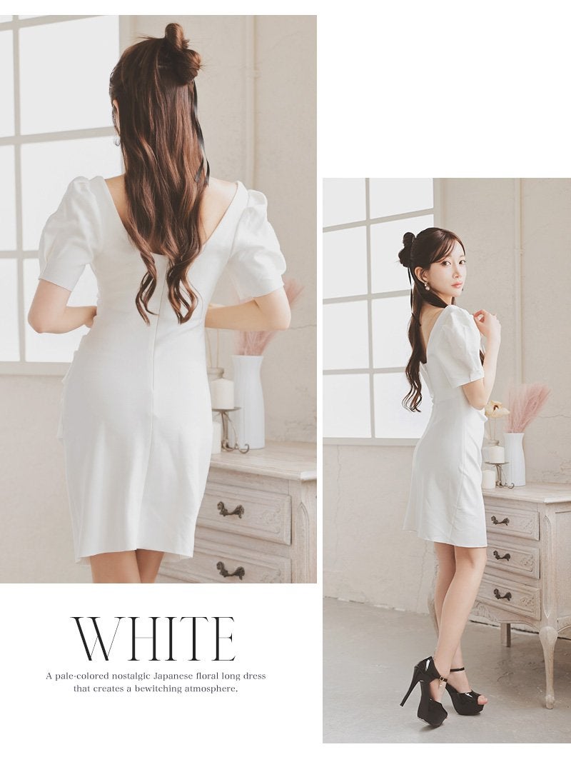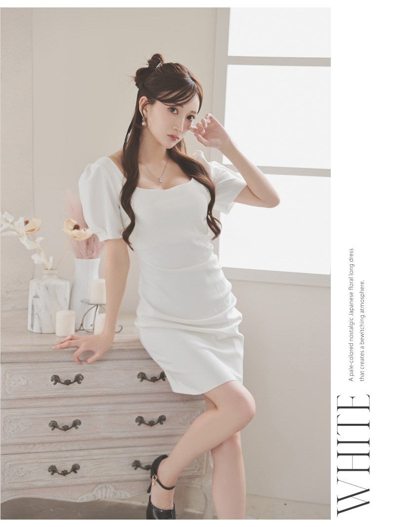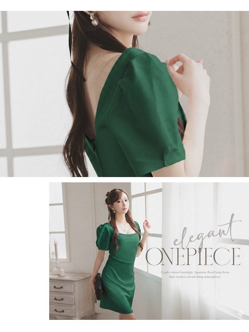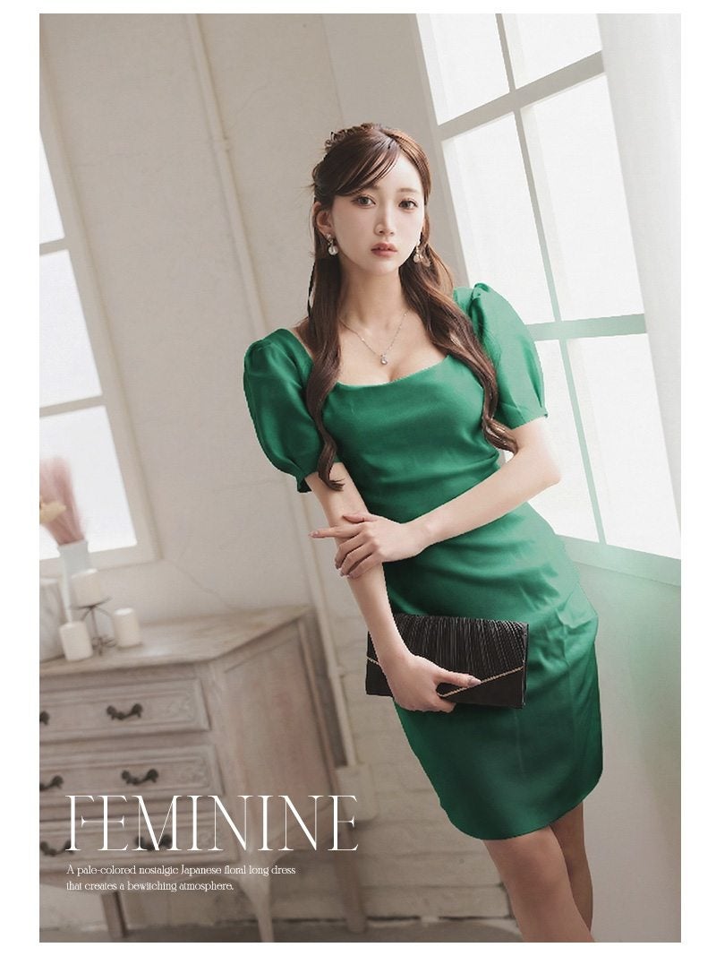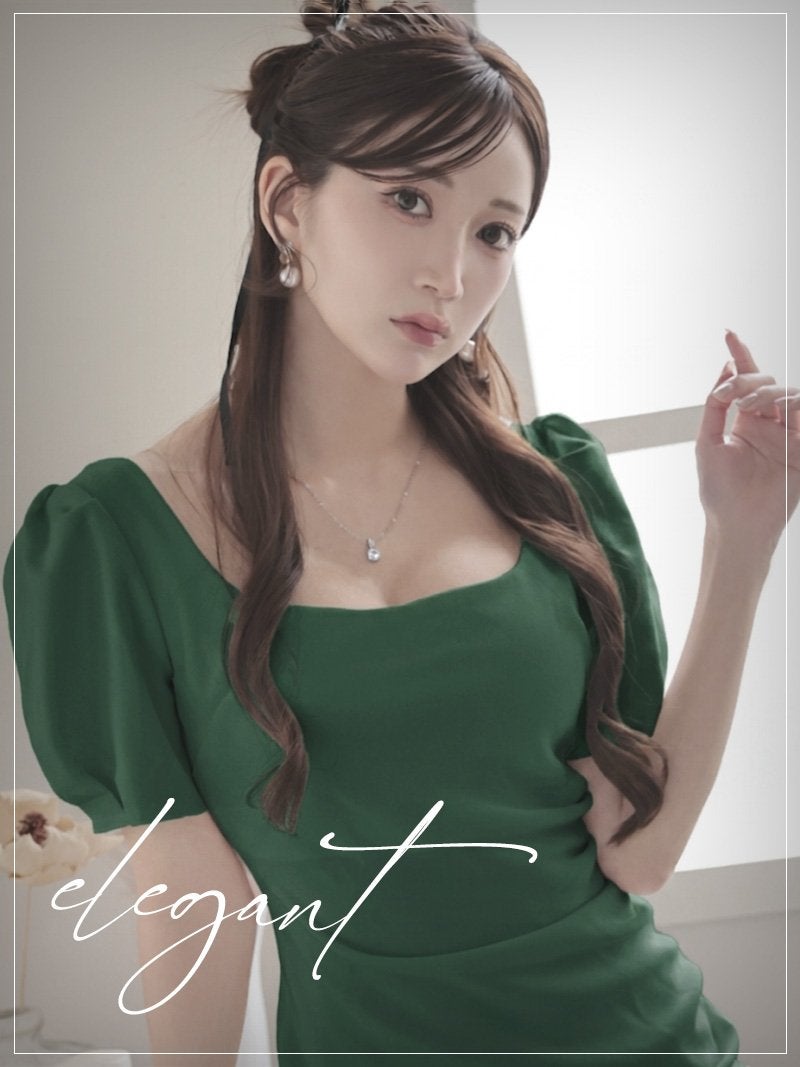 上品なパフ袖と美デコルテで魅せる、しっとり質感の大人韓国styleワンピース。 美デコルテを強調するスクエアネックとパフ袖が上品な大人韓国風ミディ丈キャバワンピース KANO 着用 キャバワンピース【DaysPiece】(S/M/L)(ホワイト/グリーン)