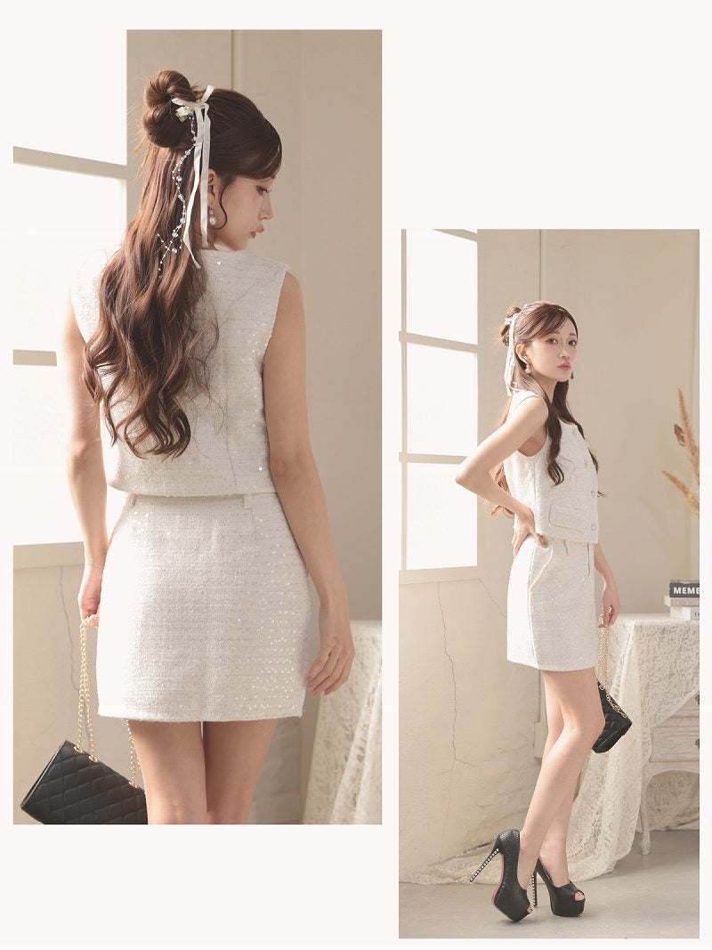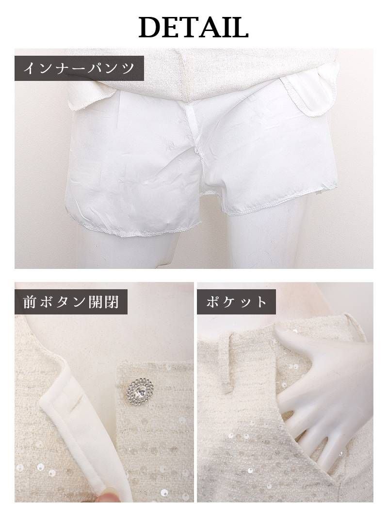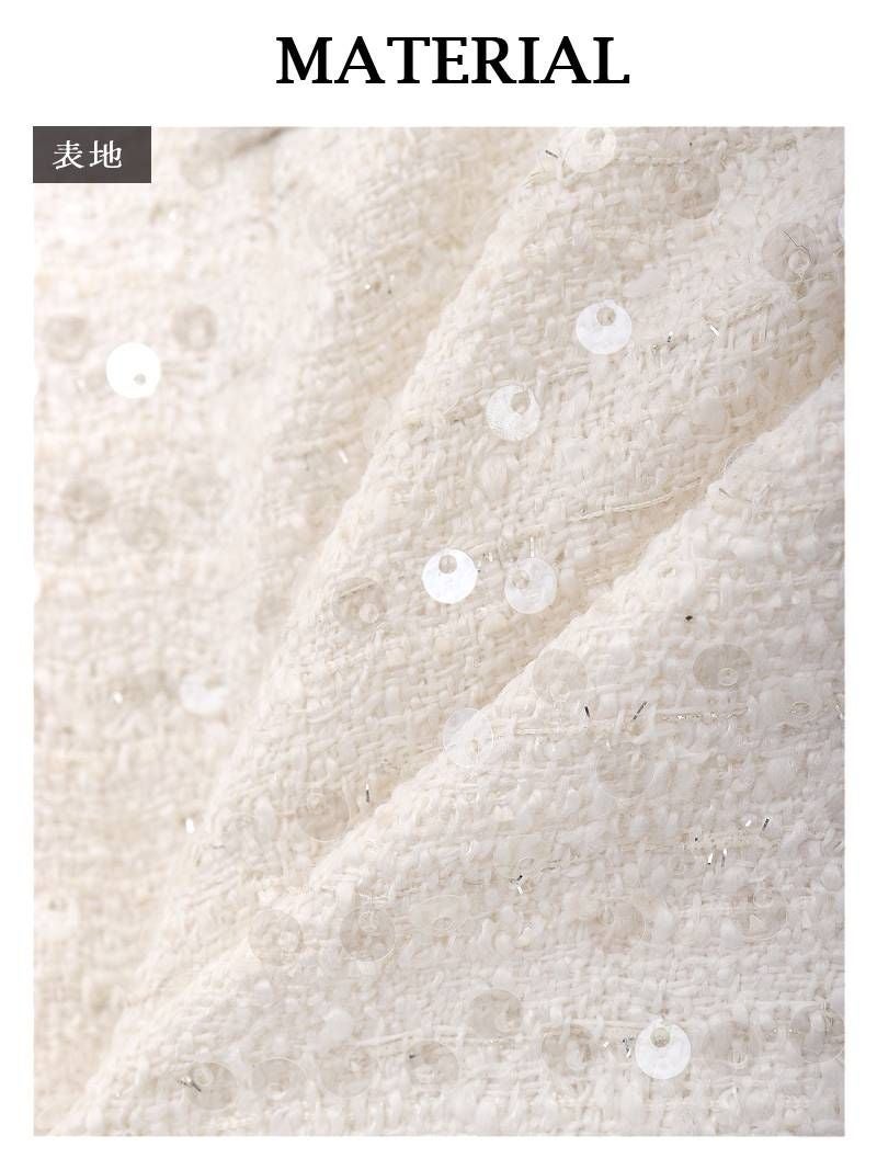 スパンコールの輝きとビジューのアクセントで周囲の視線を釘付け! 先行予約割¥7580→¥7200!※一部予約販売※スパンコールの煌めきとビジューボタンが可愛いノースリーブのツイードセットアップスーツ 【Ryuyu】(S/M/L)(オフホワイト)