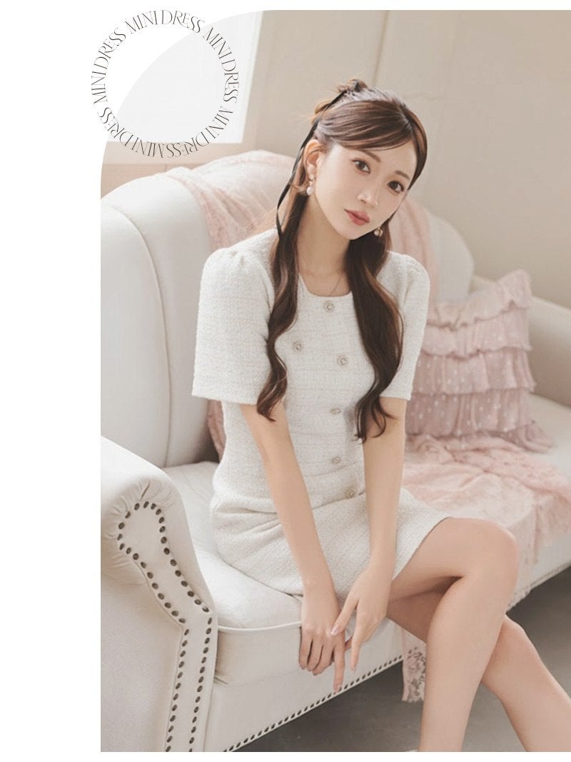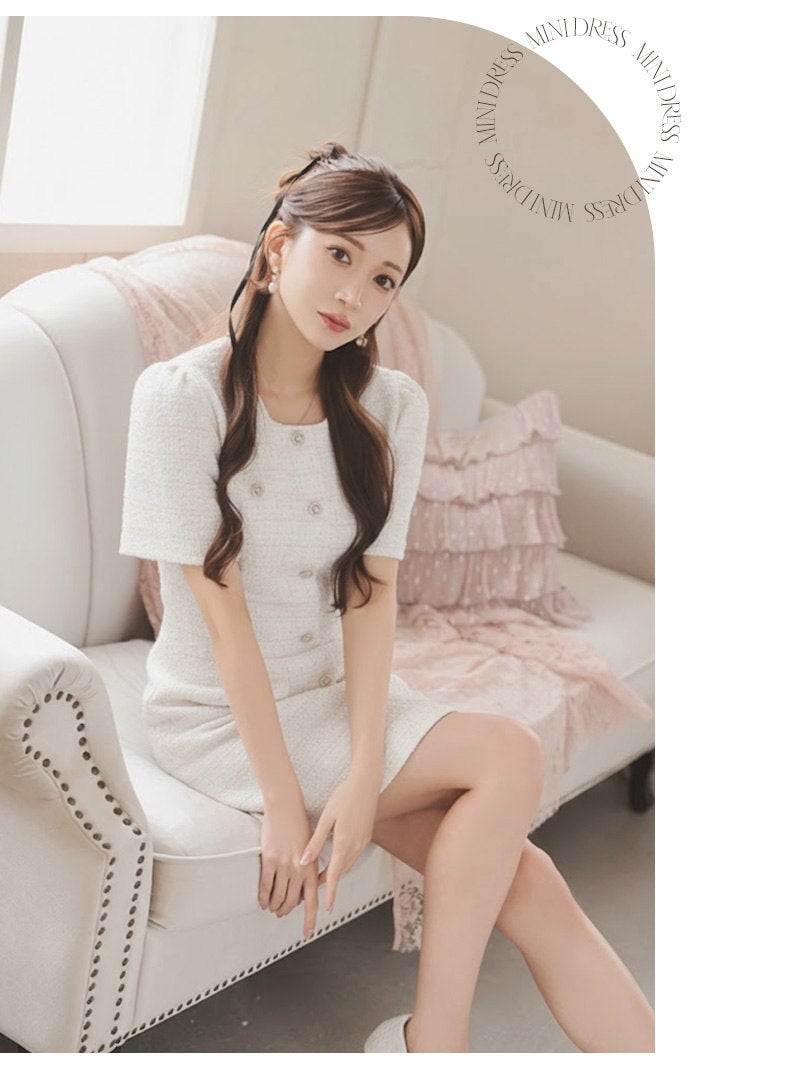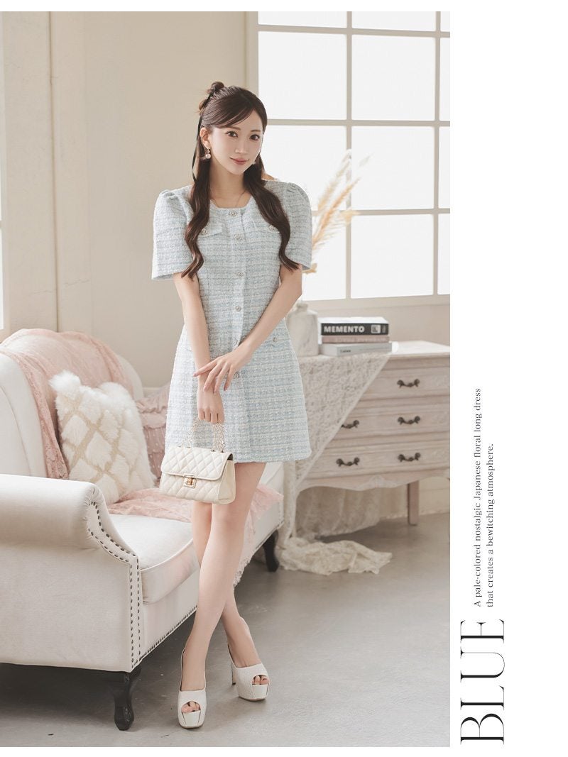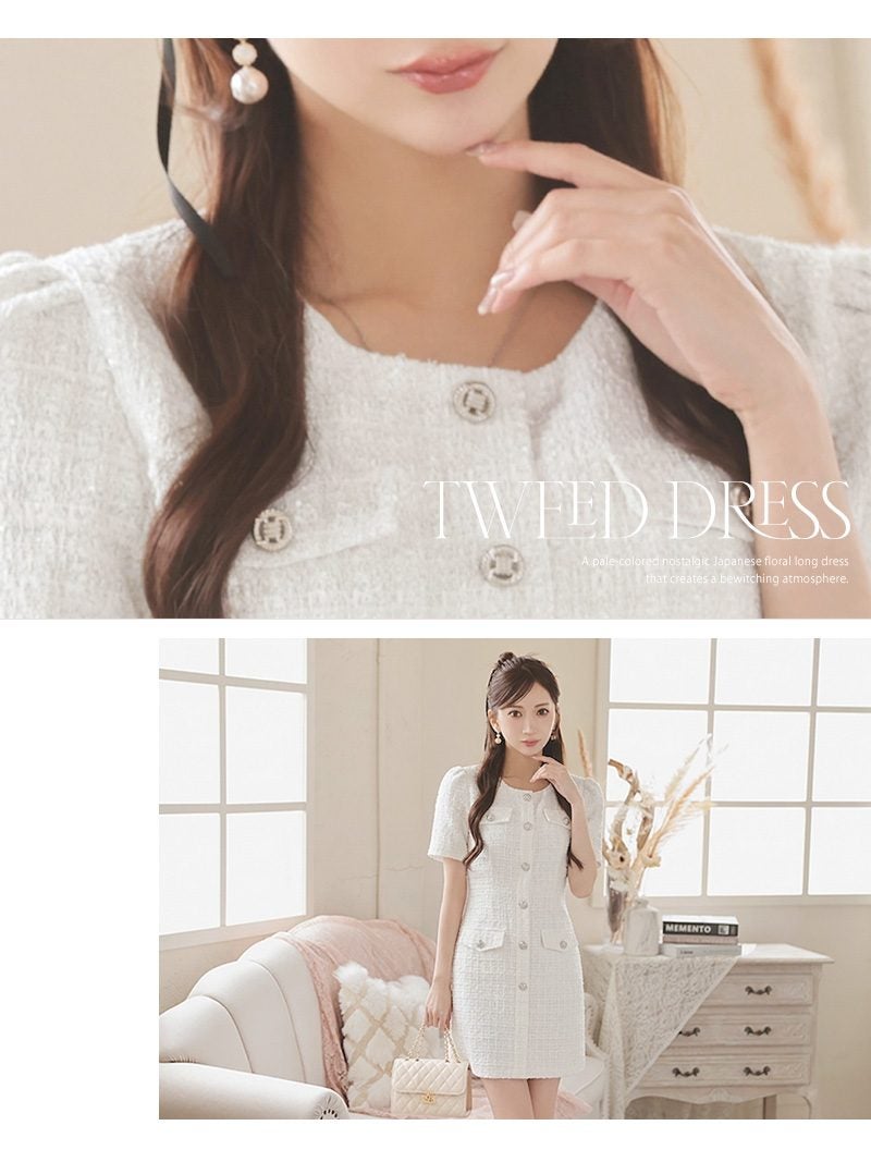 上品なツイード素材とドール風のシルエットで、最高に大人可愛い自分を演出。 先行予約割¥7980→¥7581!※一部予約販売※上質な肉厚ツイード生地で仕立てたウエストくびれが際立つドール風袖付きミニドレス 【Ryuyu】(M/L)(ホワイト/ブルー/ピンク/ブラック)