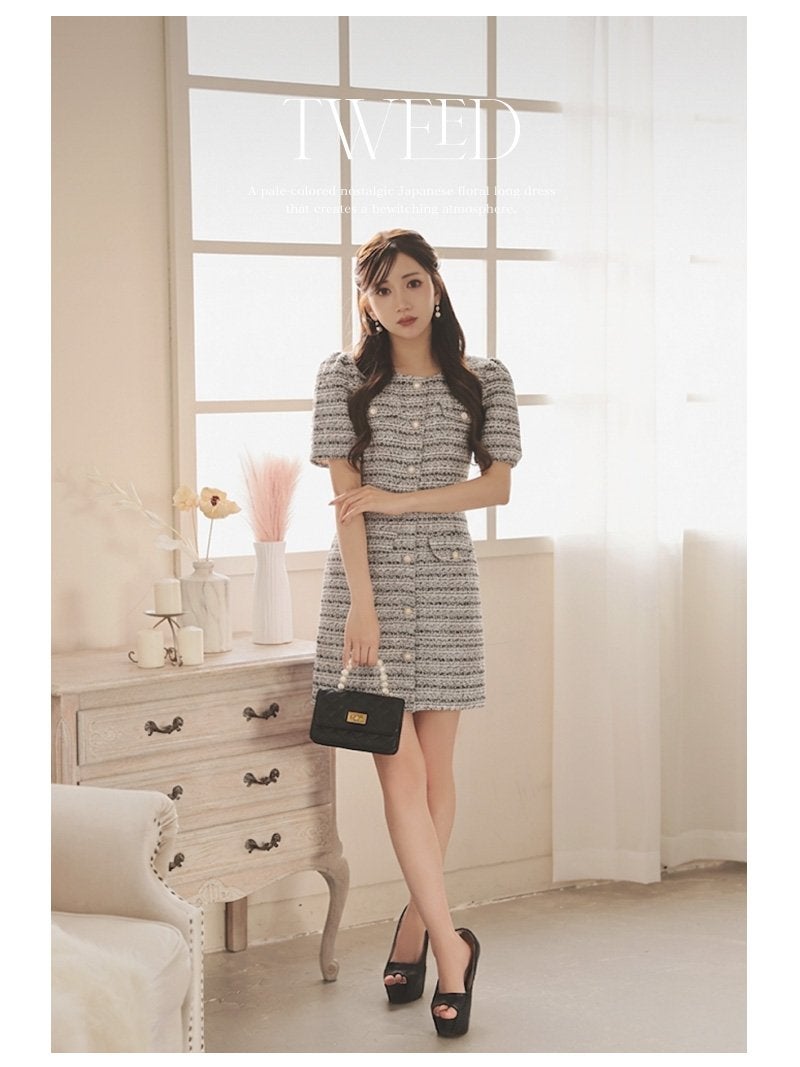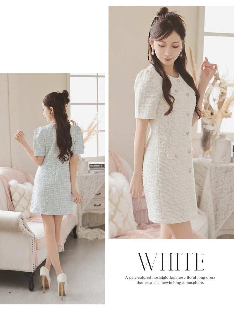 パステルカラーの肉厚ツイードで上品なドール風スタイルを叶える袖付きミニドレス。 先行予約割¥7980→¥7581!※一部予約販売※表情豊かなミックスツイードが上品で肉厚な生地感の袖付きキャバワンピース【Ryuyu】(M/L)(ホワイト/ブルー/ピンク/ブラック)