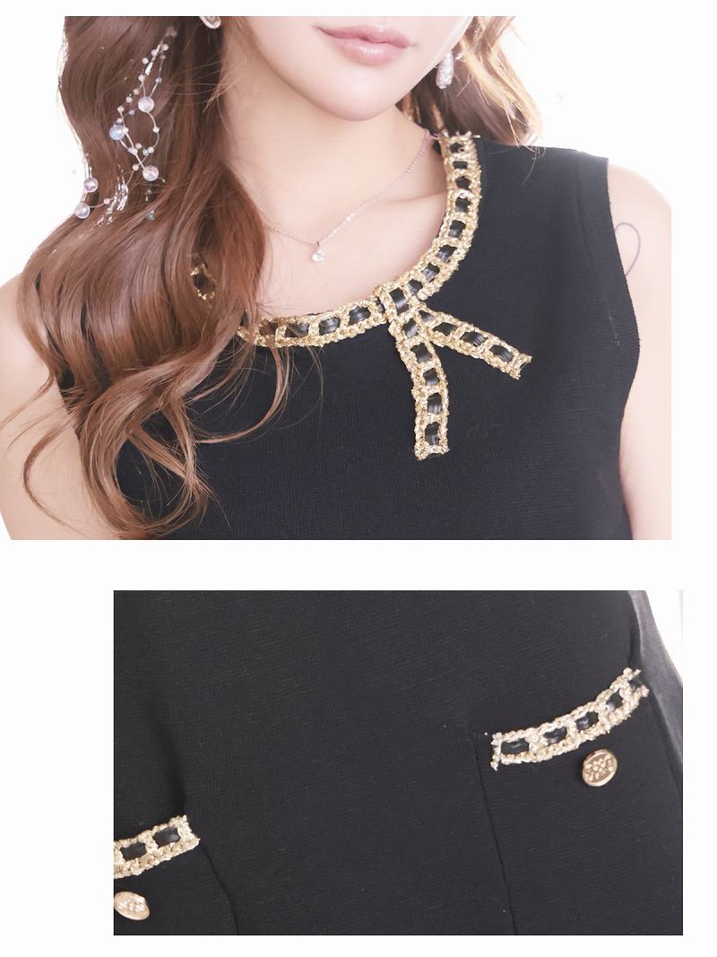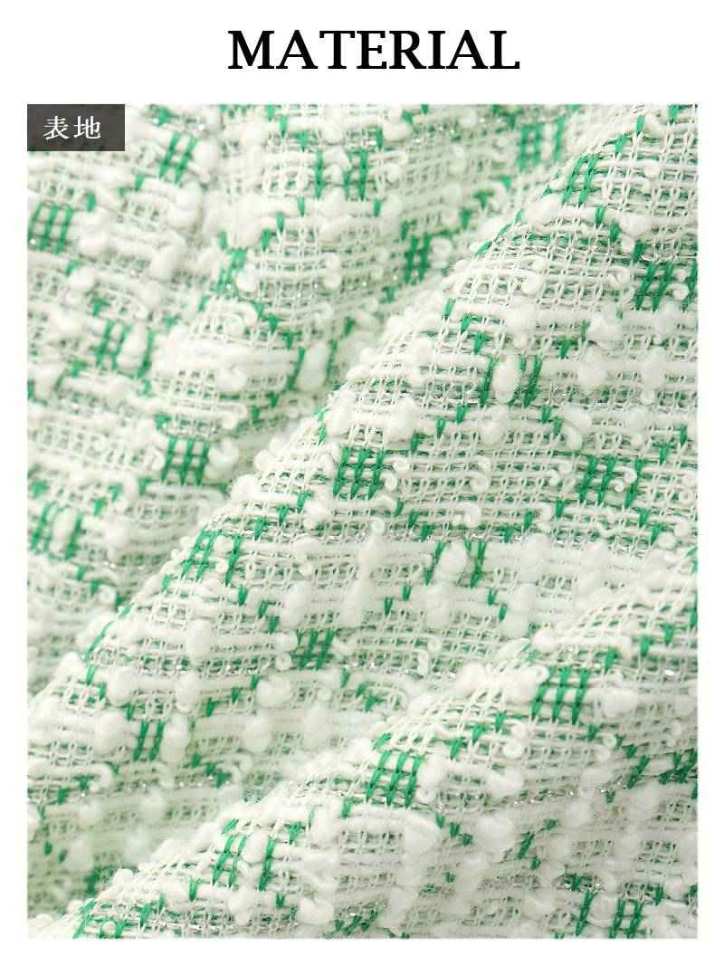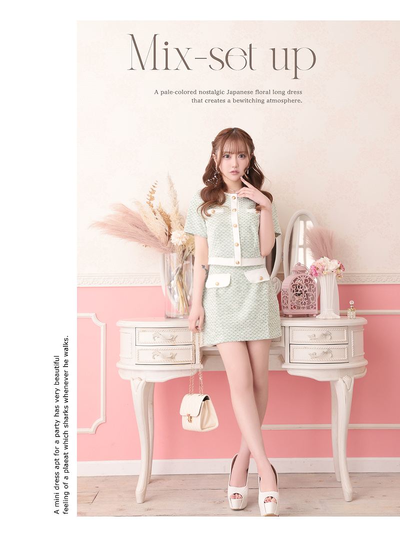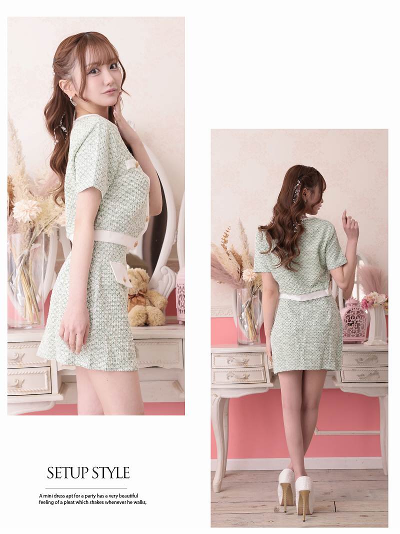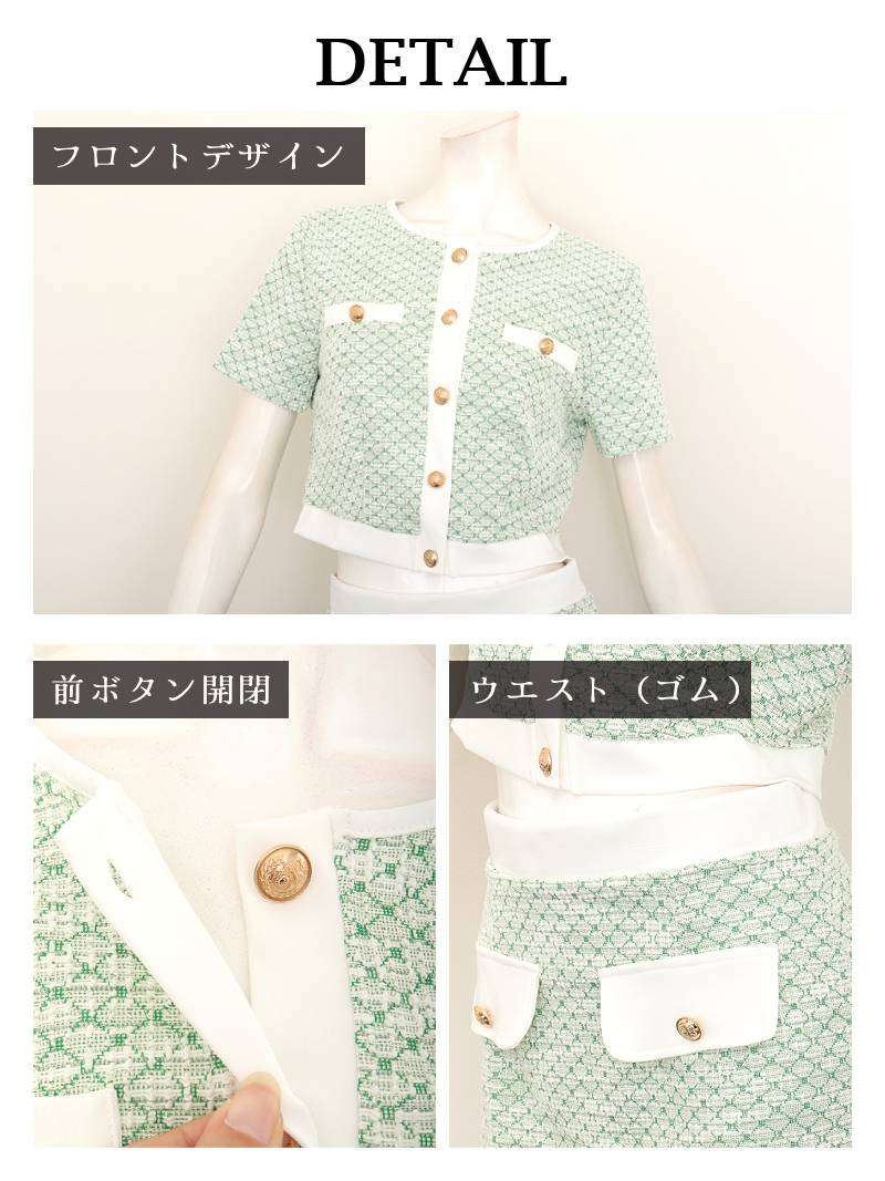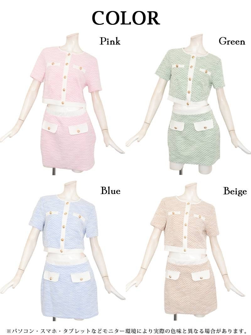 春を彩るパステルカラーと上品なゴールドボタンが大人可愛いツイード風ニットアップ♪ パステルカラーの春ツイードが上品に映えるストレッチニット素材のパイピングセットアップドレス りせり 着用 キャバドレス【RyuyuChick】(M)(ベージュ/グリーン/ブルー/ピンク)