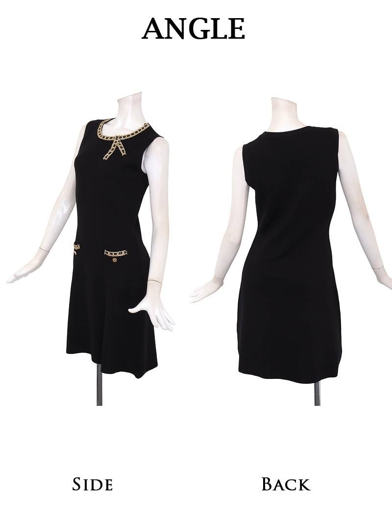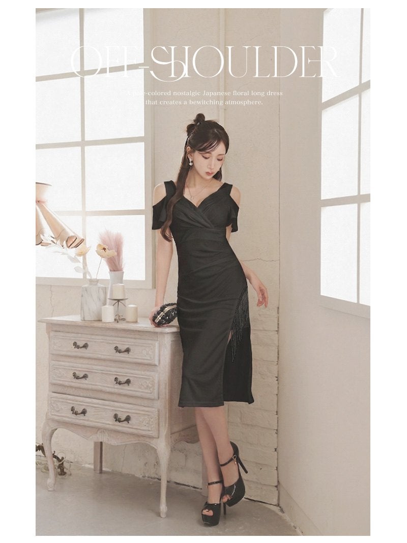 煌めくフリンジとカシュクールで魅せる大人の色気漂うブラックドレス。 先行予約割¥6980→¥6630!※一部予約販売※揺れるビジューフリンジがアクセントのカットショルダーカシュクール膝丈ブラックドレス 【Ryuyu】(S/M/L/XL(2L))(ブラック/ホワイト)