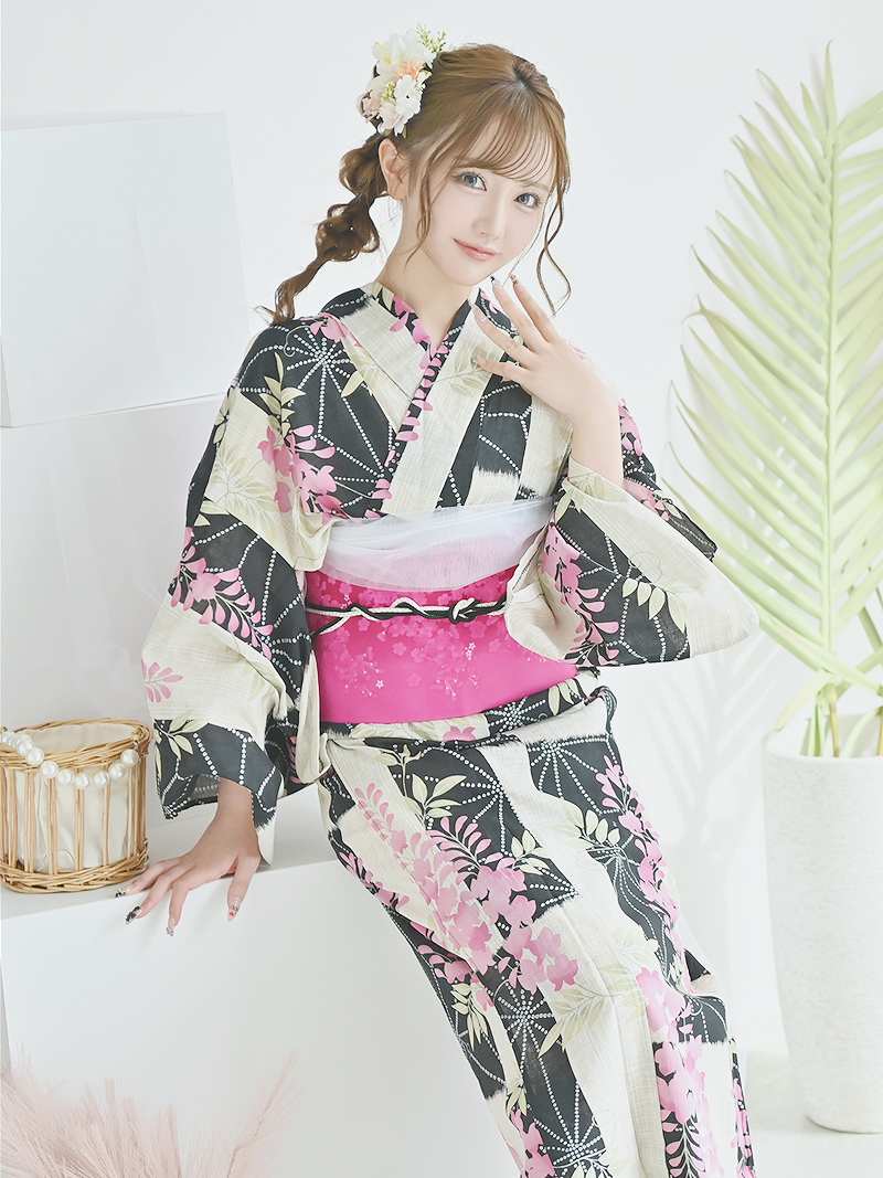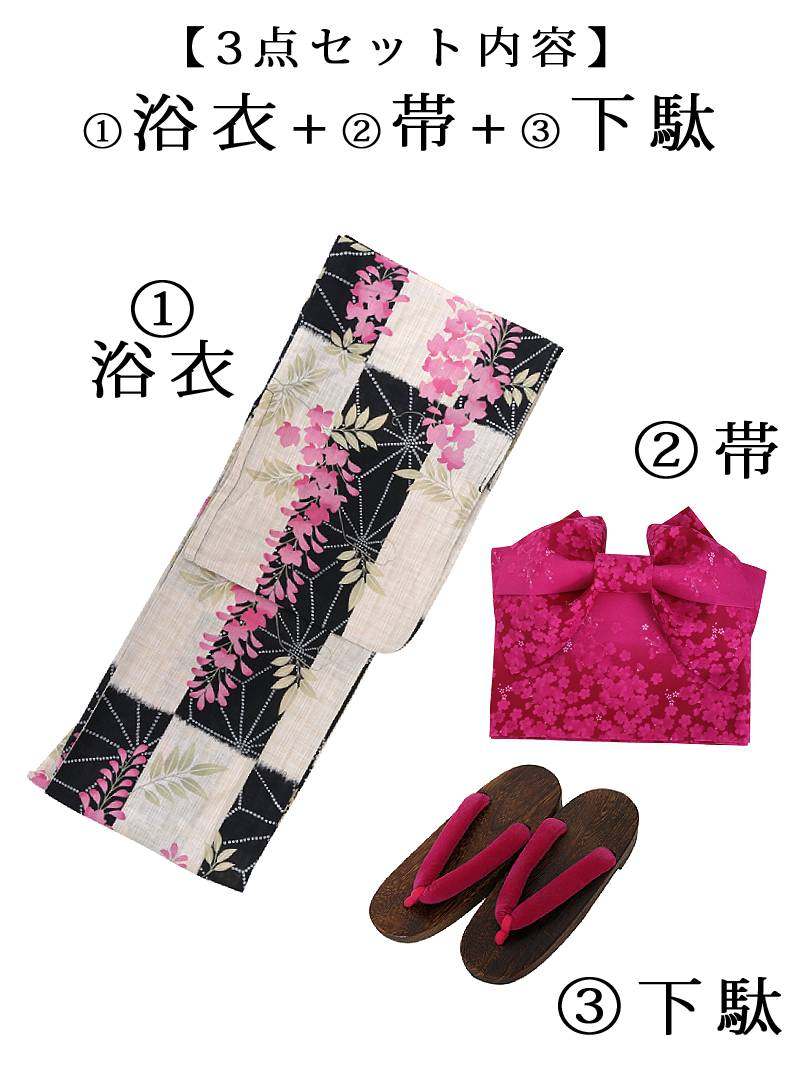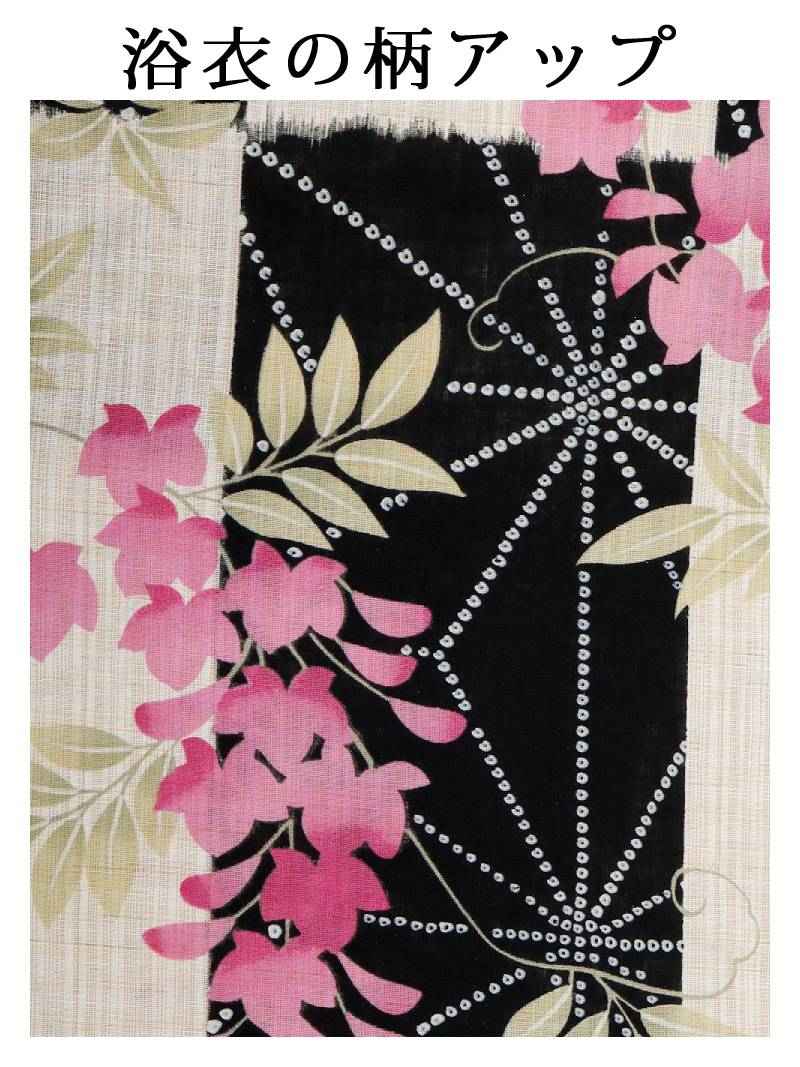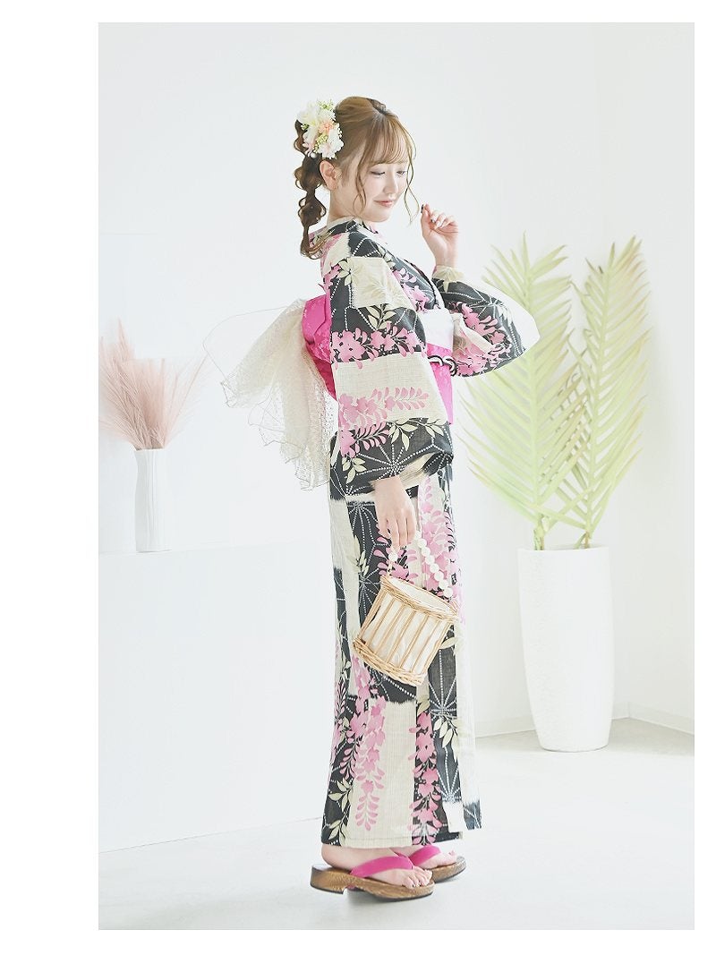 落ち着いた藤の花に旬のモダンさを添えた、大人の色香漂う3点セット浴衣。 浴衣 凛とした藤の花がモダンに彩る大人可愛い特価浴衣3点セット りせり 着用 浴衣【Ryuyu】(フリーサイズ)(ピンク)