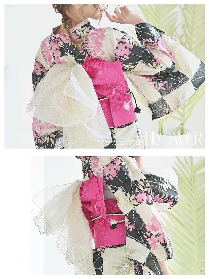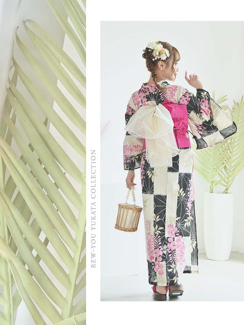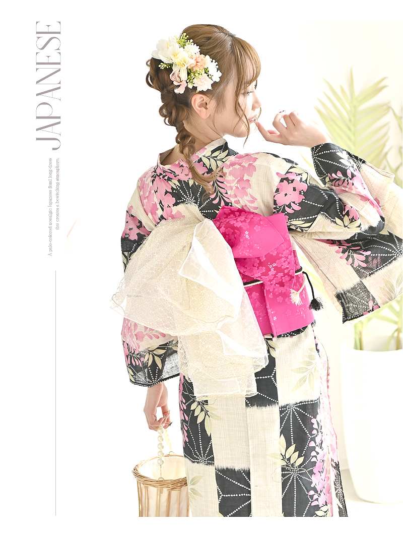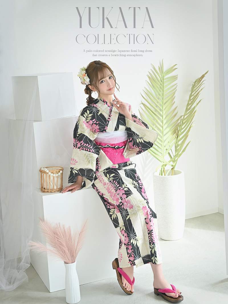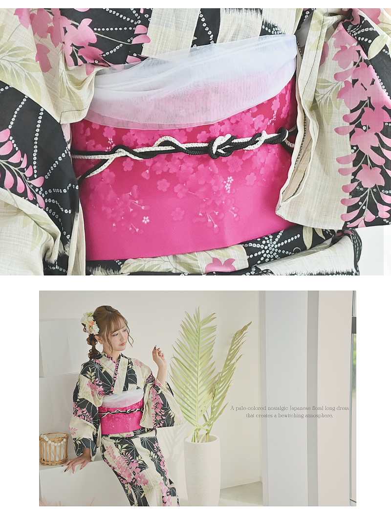 落ち着いた藤の花に旬のモダンさを添えた、大人の色香漂う3点セット浴衣。 浴衣 凛とした藤の花がモダンに彩る大人可愛い特価浴衣3点セット りせり 着用 浴衣【Ryuyu】(フリーサイズ)(ピンク)