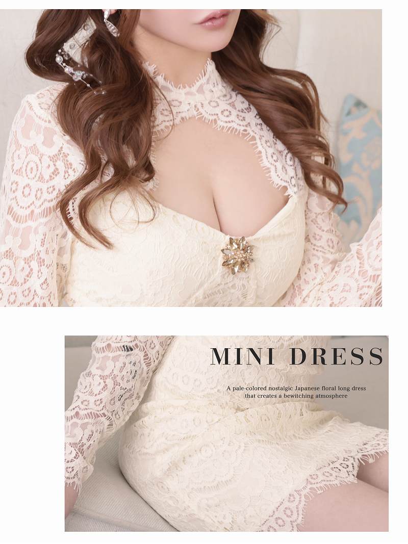 透け感のある総レースと煌めくブローチが大人な色気を引き立てる上品ミニドレス。 先行予約割¥4280→¥4065!※一部予約販売※胸元のブローチ付きで高級感漂う透け感あるレース袖の総レース長袖ミニドレス りせり 着用 キャバドレス【RyuyuChick】(S/M/L)(オフホワイト/ブラック)
