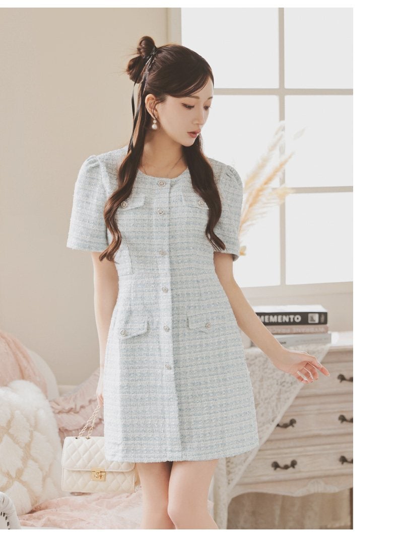 パールボタンとラメツイードで品格を纏う、清楚系チェック柄ワンピーススーツ。 先行予約割¥6980→¥6630!※一部予約販売※パールボタンが上品に輝くノーカラーのニットツイードチェック柄ワンピーススーツ 【Ryuyu】(XS/S/M/L)(ピンク/ブルー/ホワイト)
