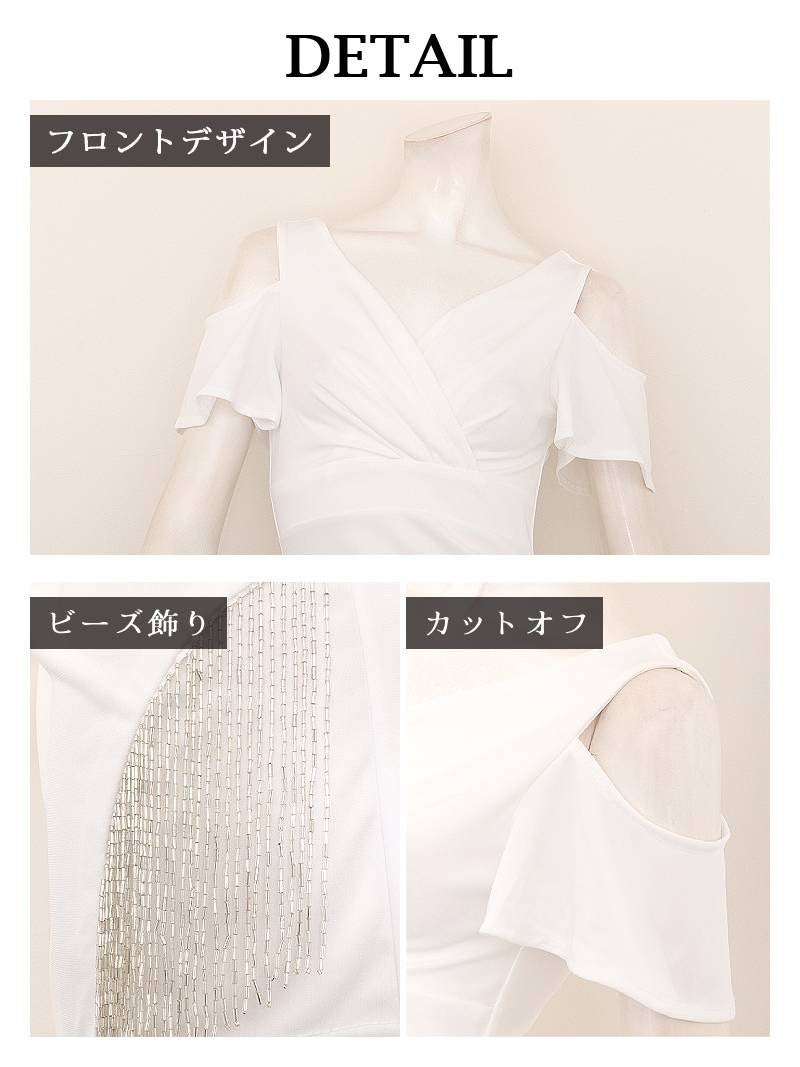 揺れるビージュフリンジと大人な肌見せで周囲の視線を独占する膝丈ドレス。 先行予約割¥6980→¥6630!※一部予約販売※ビジューフリンジ付きのカシュクールデザインが大人っぽいカットショルダー膝丈ストレッチドレス 【Ryuyu】(S/M/L/XL(2L))(ブラック/ホワイト)