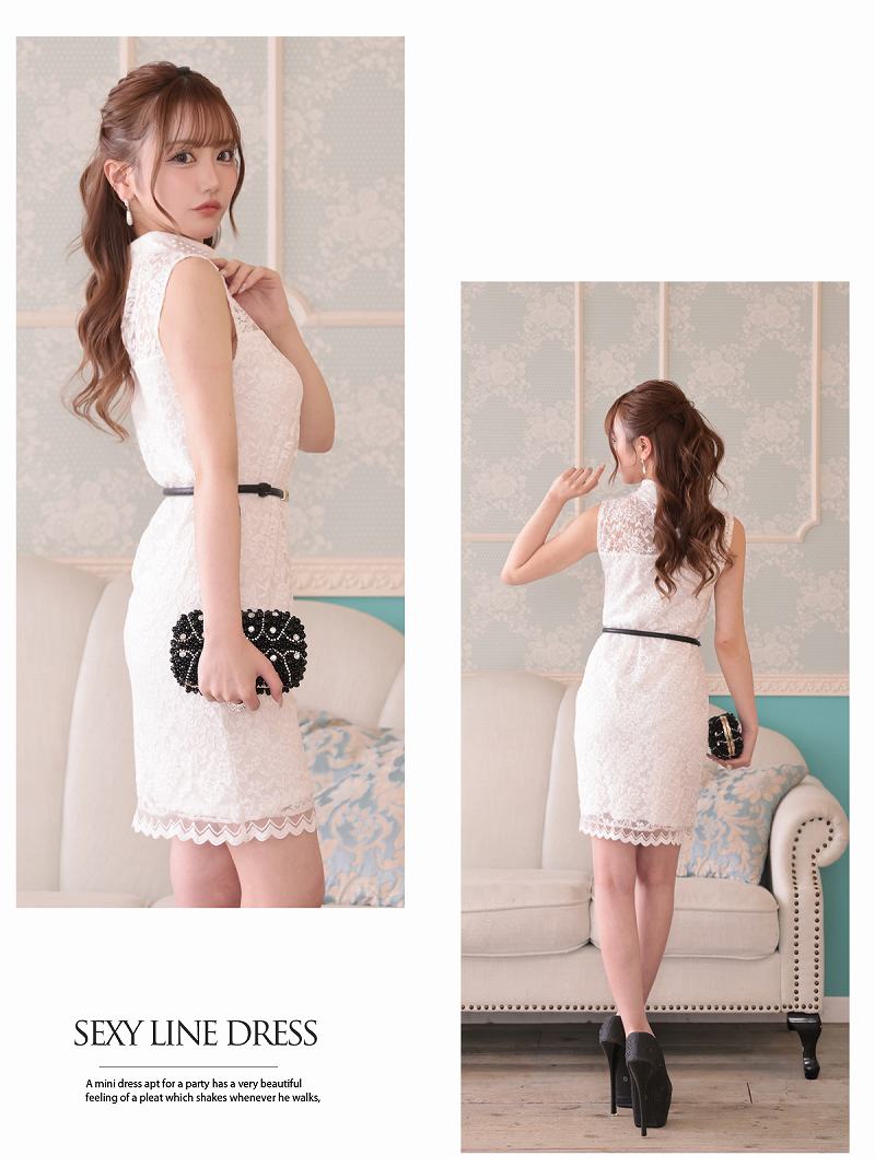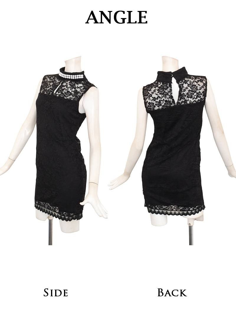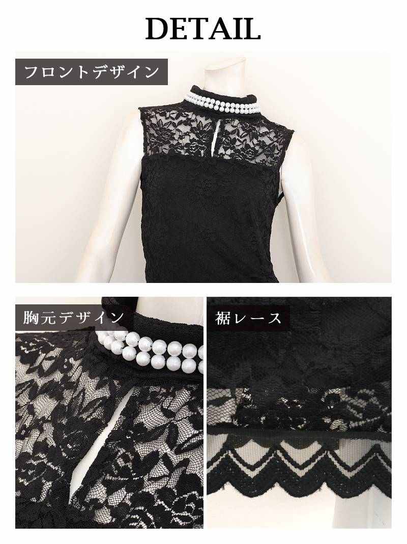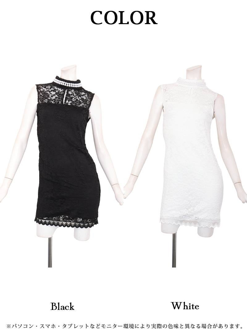 上品なパールと繊細なレースで気品あふれる色気を放つタイトドレス。 パールネックが上品な透け感のある総レース使いのタイトラインノースリミニドレス りせり 着用 キャバドレス【RyuyuChick】(S/M/L)(ブラック/ホワイト)