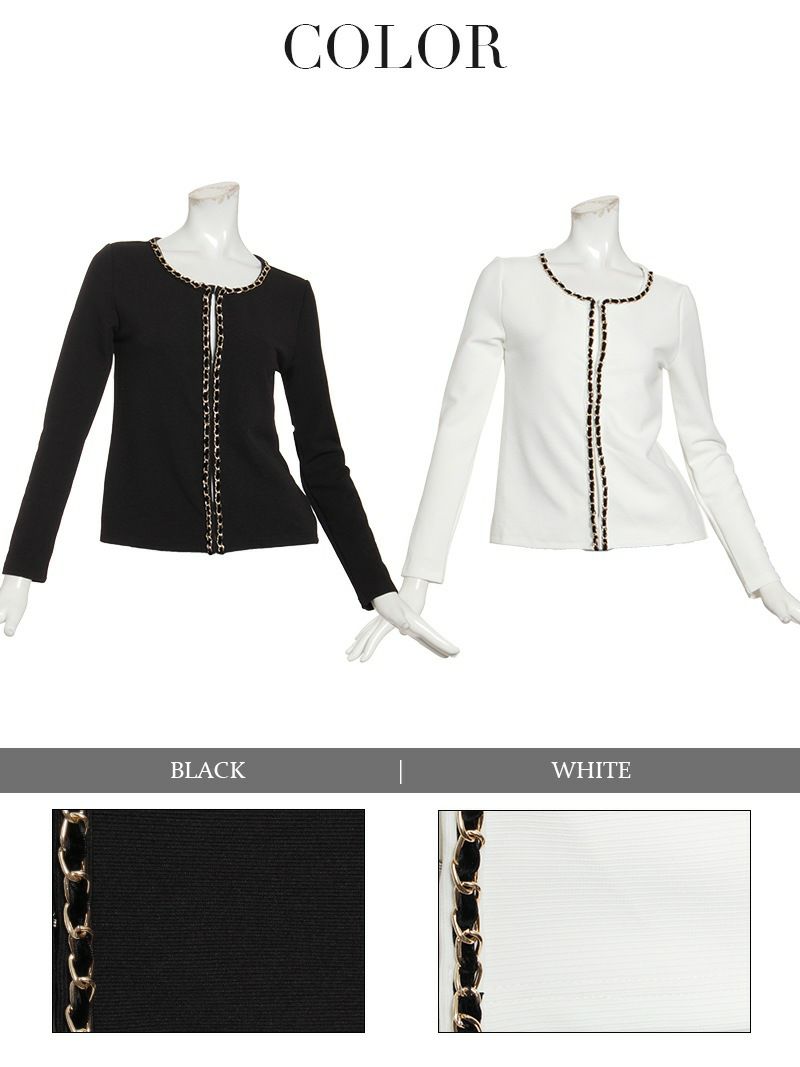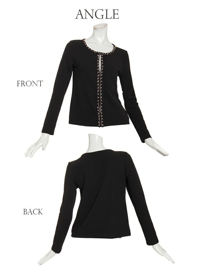 チェーン付きデザインがアクセントになり、結婚式やパーティーにもぴったりな羽織アイテム。