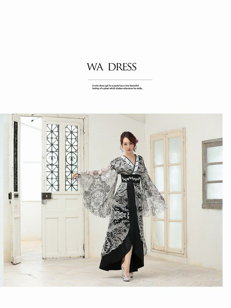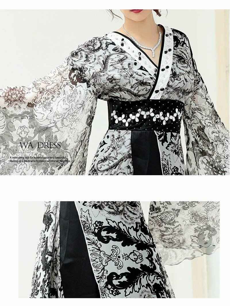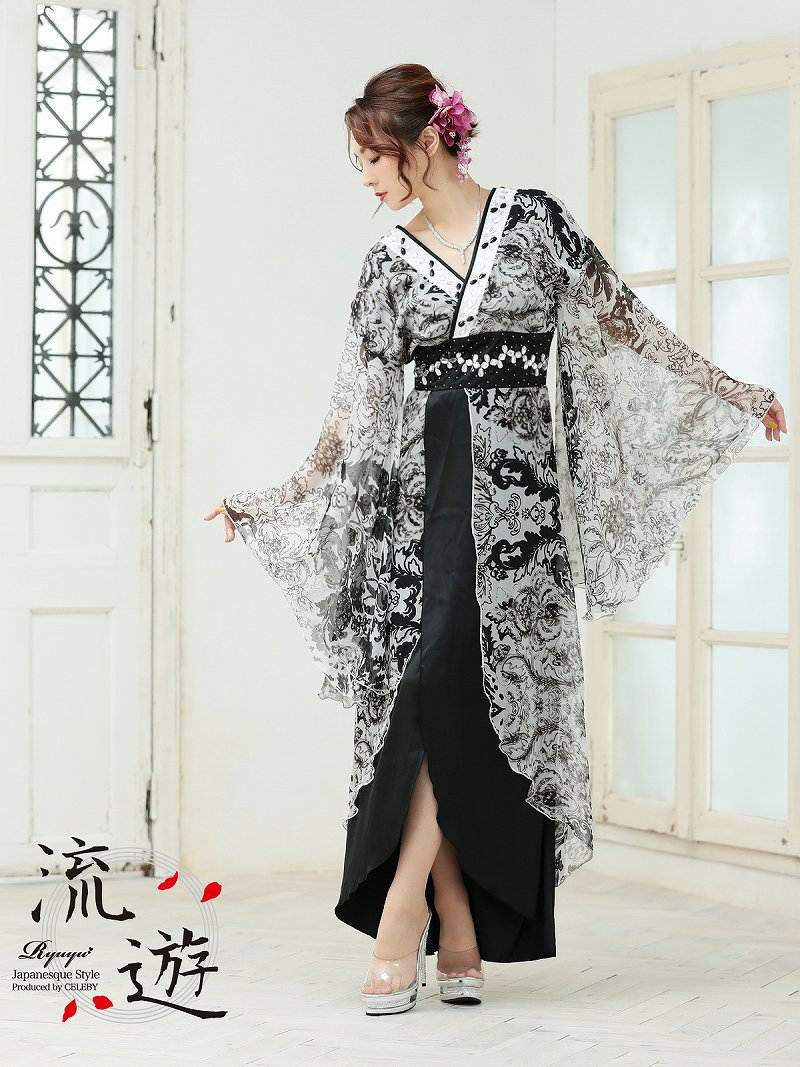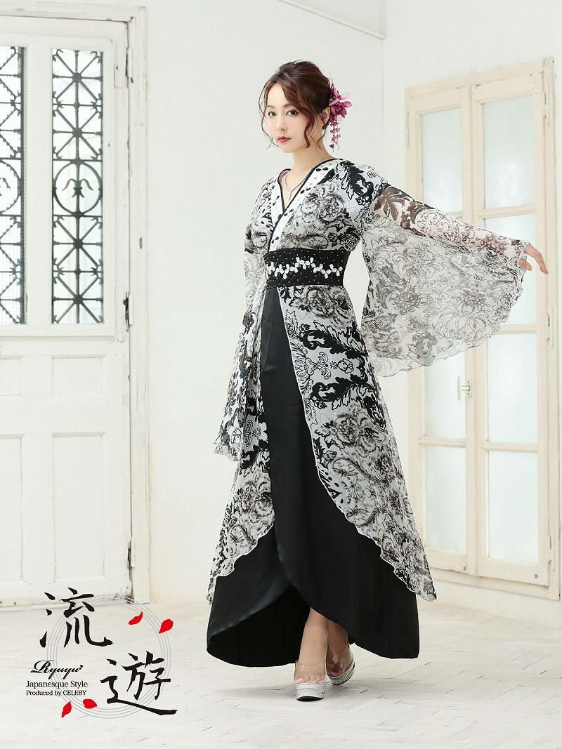 モノトーン艶やかシフォン花魁和柄ドレス 【流遊】