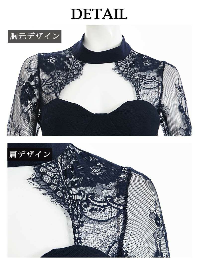 繊細なリバーレースが魅力のハイネックデザインに、大胆なバストカットをプラスした色気溢れるキャバドレス。