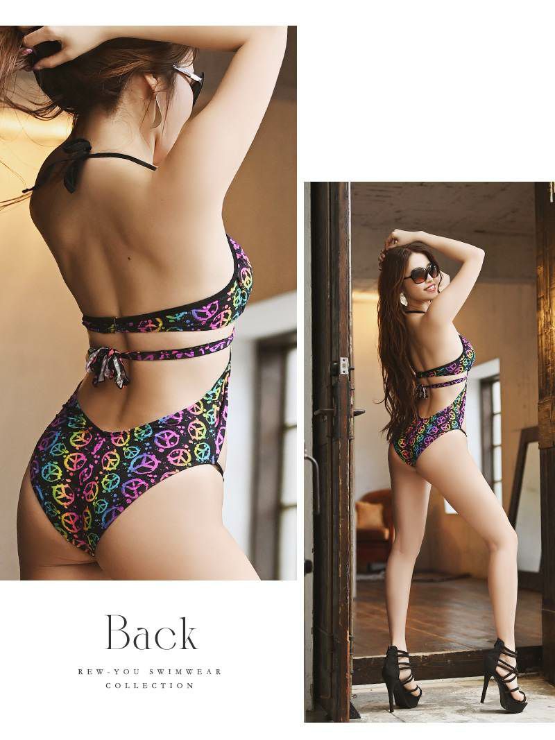 レインボー×ピース柄でとにかく目立てる水着!派手カラーが映えすぎるイベント向けビキニはフェスにオススメ!バスト盛れ確定なホルターデザインが推し!ショーツの結び方で雰囲気チェンジもOKなビキニ。誰ともかぶらない最強キャバ水着ならコレ一択。