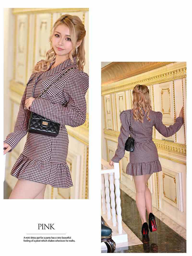 4. 【訳ありアウトレット】ツイードチェック柄ジャケットスカートキャバスーツ【Ryuyu】(M)(ブラック/ピンク/ブルー)