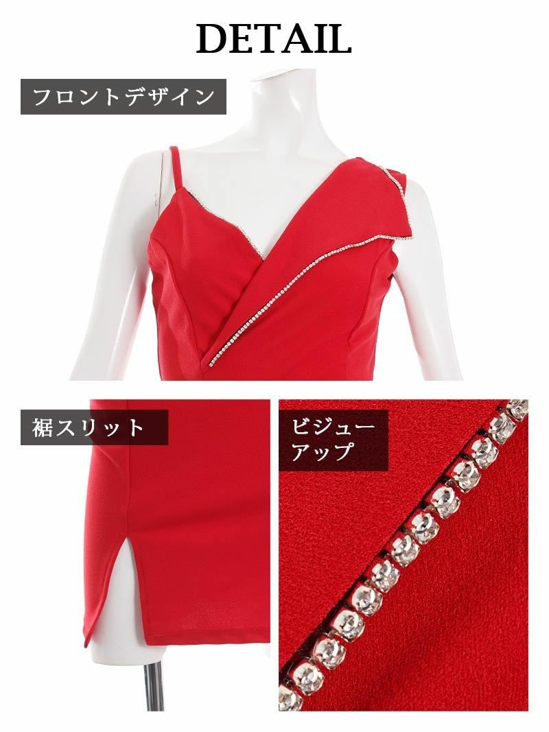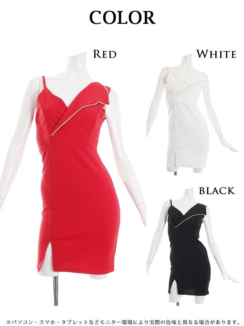 さりげないラインビジューが可愛い♪ スーパーSALE¥2990→¥2333! アシメトリービジューラインタイトキャバドレス りせり 着用ミニドレス【RyuyuChick】(M/L)(ホワイト/ブラック/レッド)