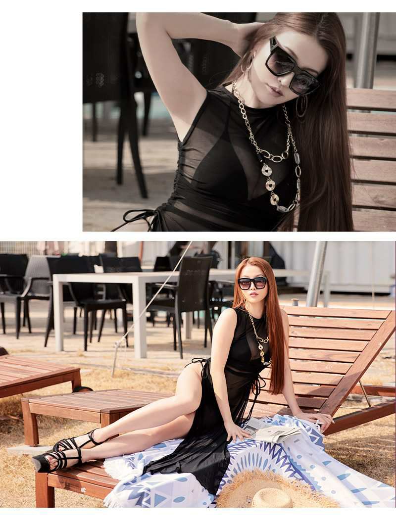 シアーの透け感がsexyなレディース水着はホルターネック風のワンピースと三角ビキニの3点セットになったインポート水着です。