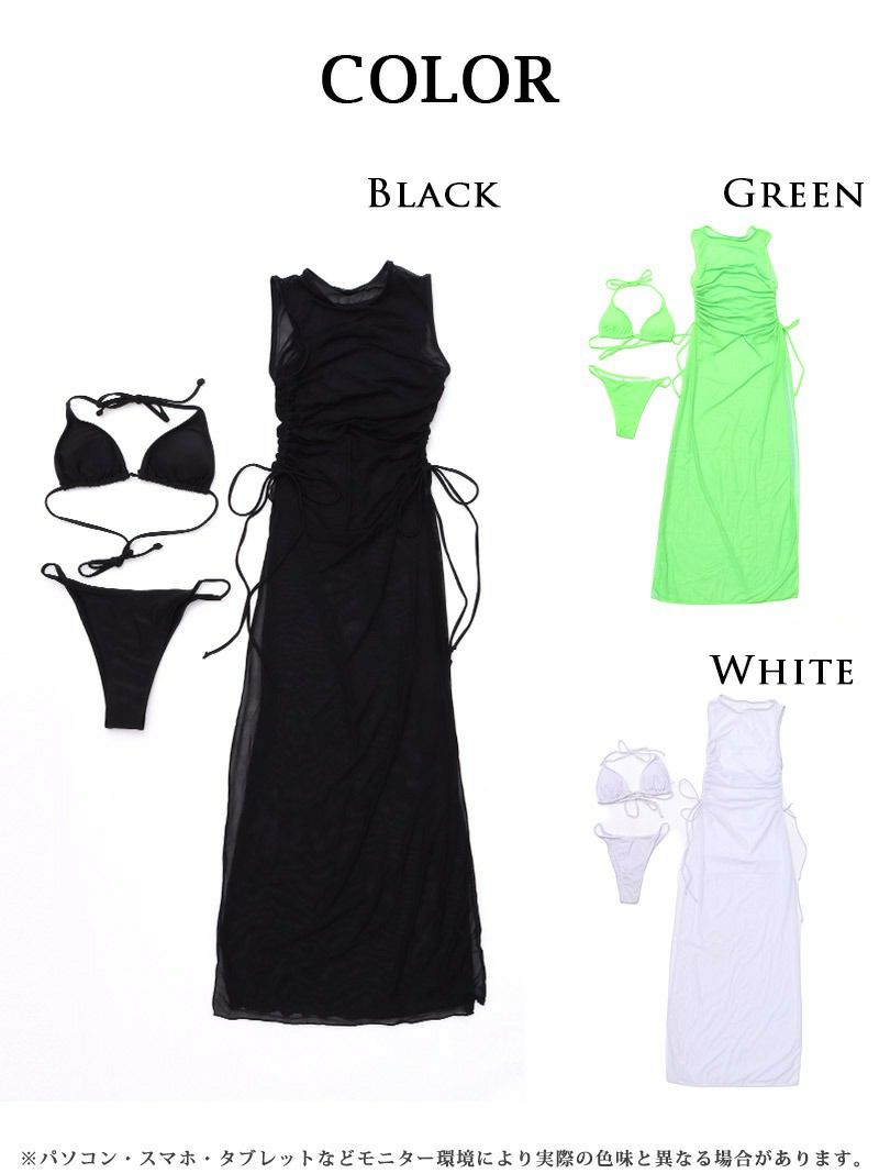4. スーパーSALE¥5480→¥4931! 水着 ワンカラーシアーワンピ付き三角ビキニ3点セットレディース水着【Ryuyu】(S-M/M-L)(グリーン/ホワイト/ブラック)