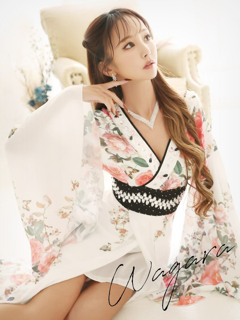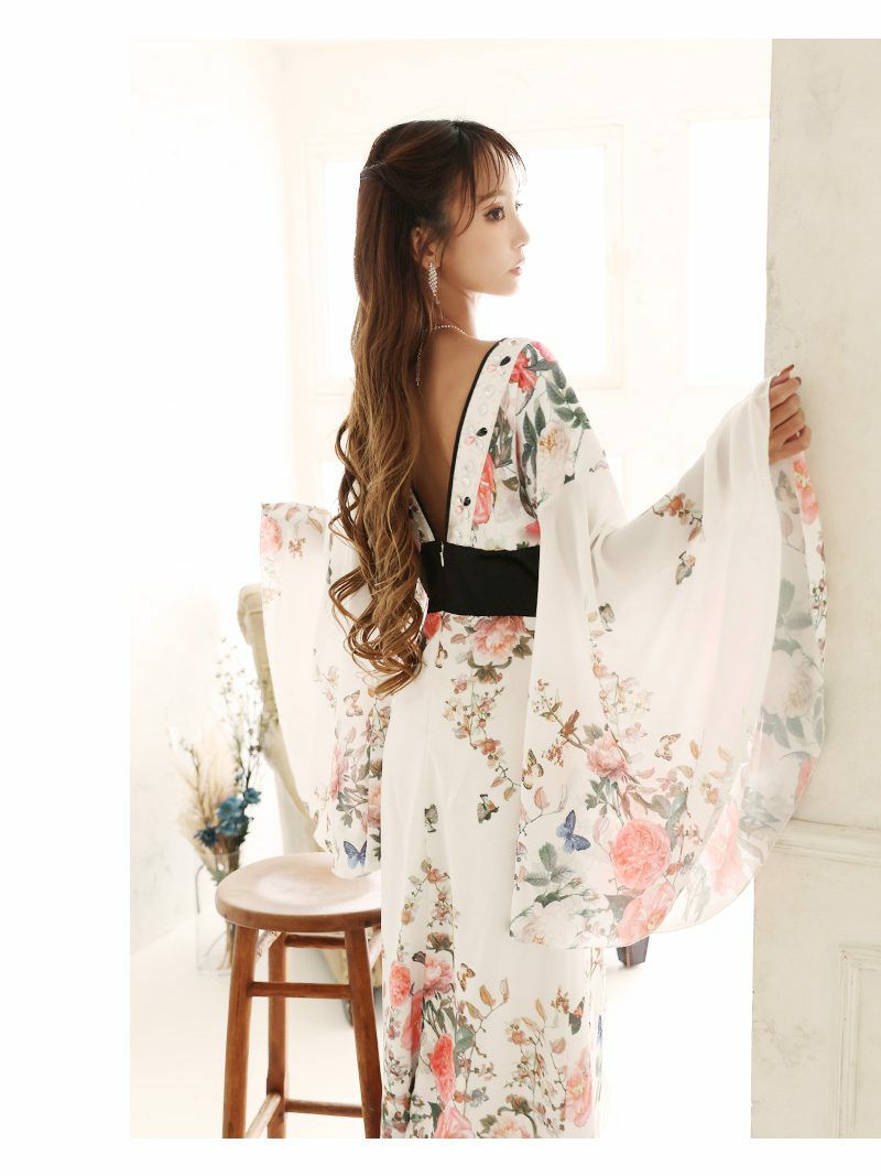 白色の着物ドレスは清楚さをアピールし男心を誘惑。でもどこかセクシーさも演出するのでお客様はあなたに見惚れるの間違いなしの着物ドレスになっています。