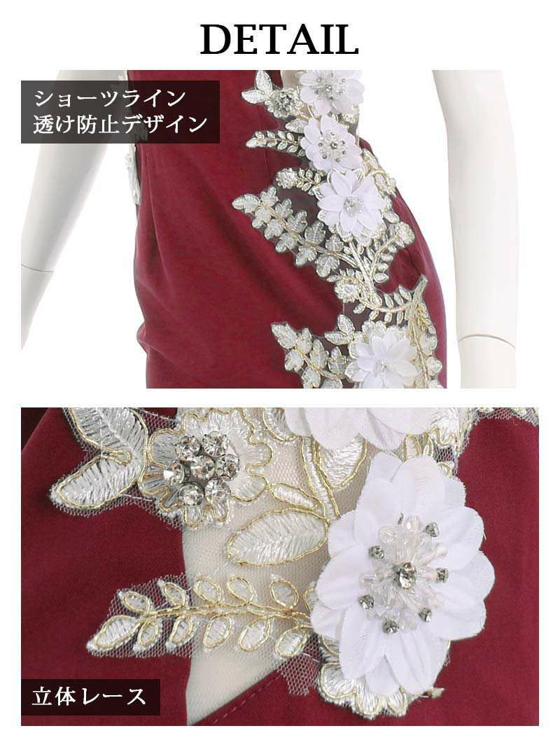 シンプルなワンカラードレスを豪華な花柄刺繍と3D立体フラワー&ビジュー使いで、ワンランク上の膝丈タイトドレスに。