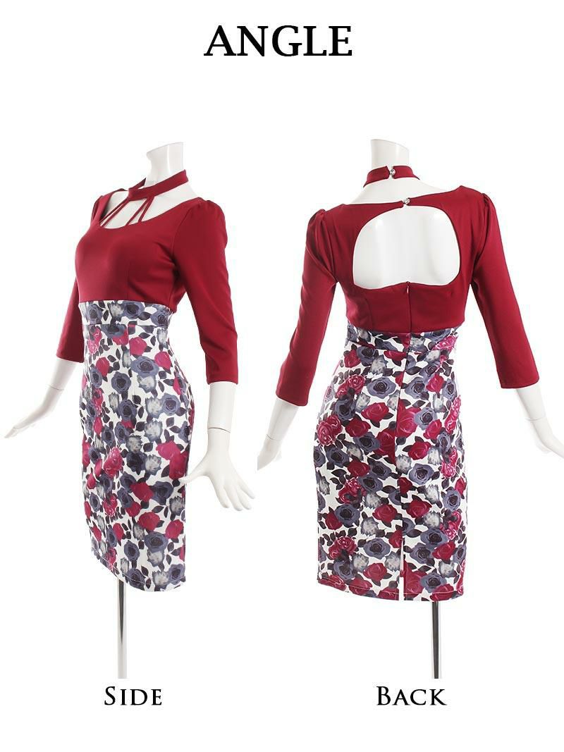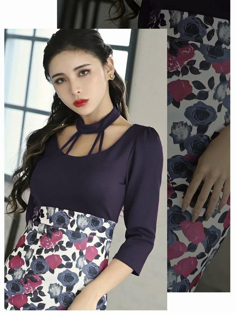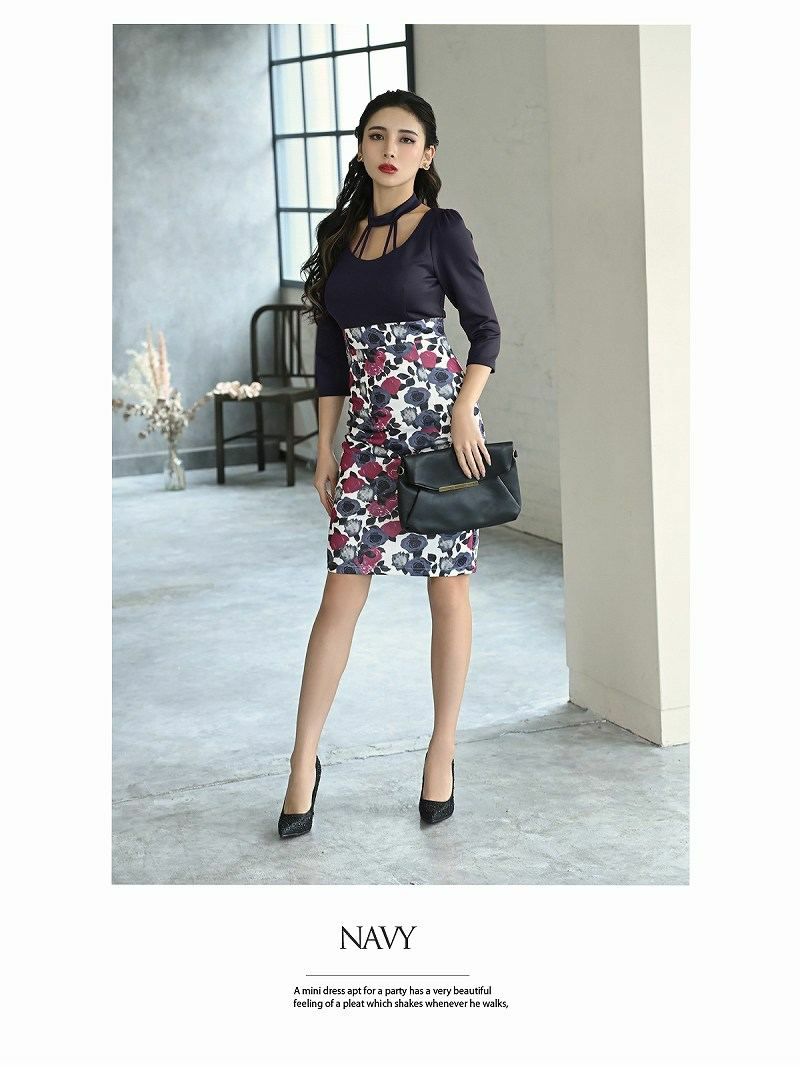 花柄×バイカラーデザインが華やかな印象を与えるミニキャバドレス。