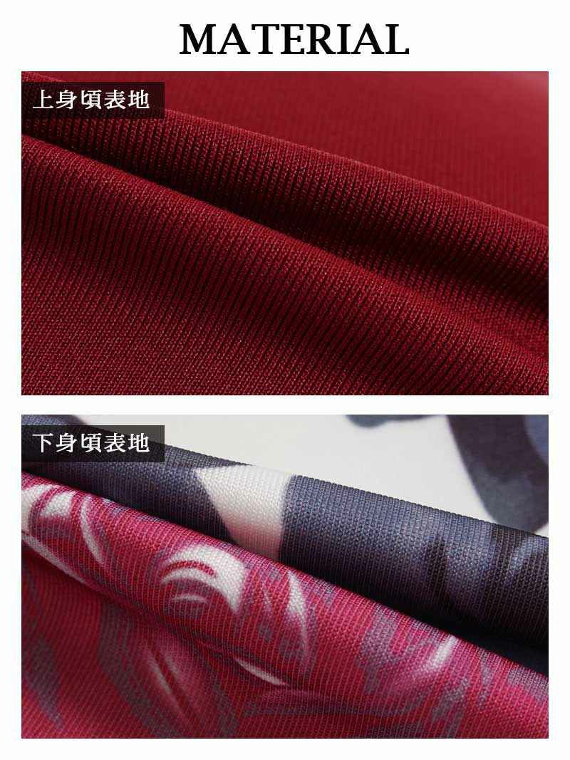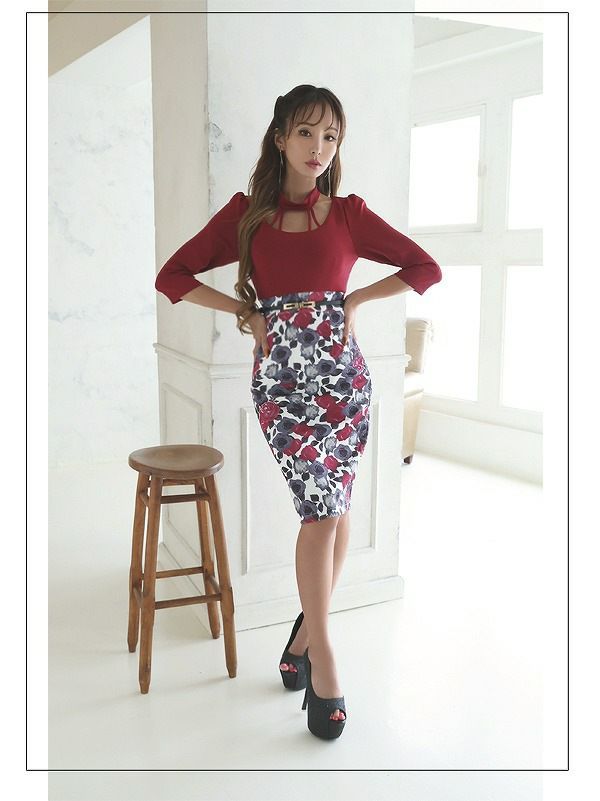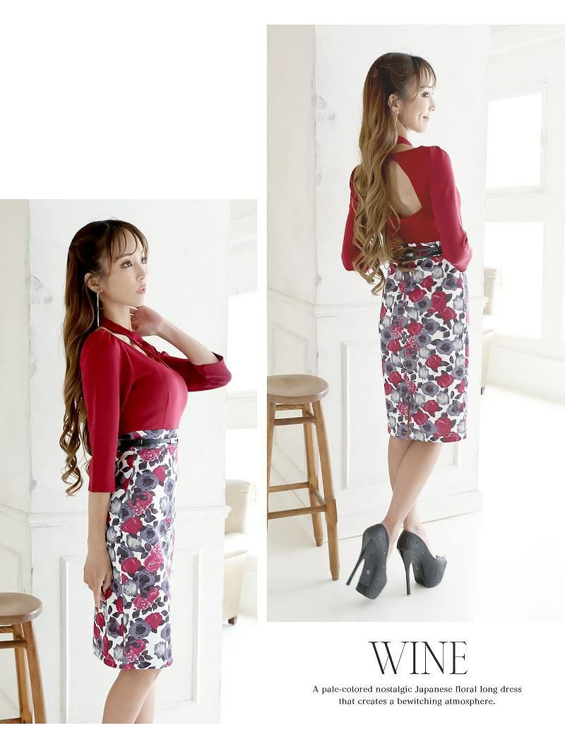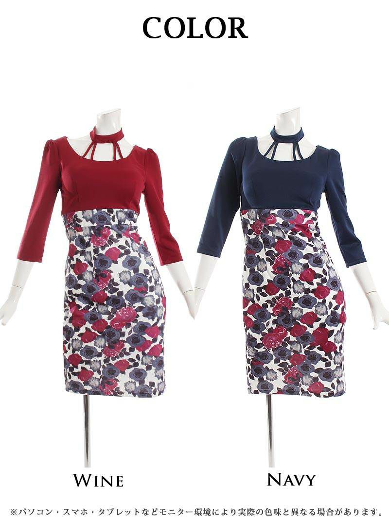 バックシャンで魅せるオルチャン風キャバドレス スーパーSALE¥6980→¥5333! 花柄×バイカラー ハイウエストミニドレス【Belsia】(S/M/L)(ネイビー/ワイン)