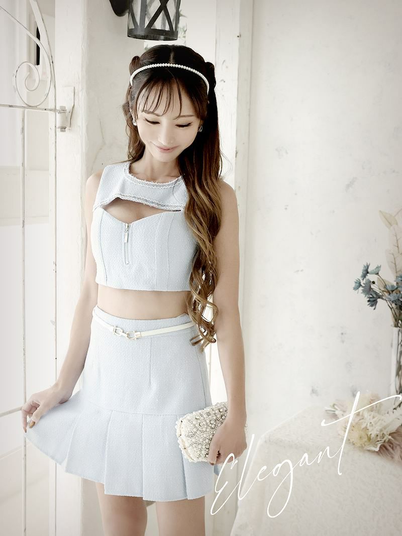 ベルト付きの豪華3点セット スーパーSALE¥9790→¥5333! 谷間見せツイードセットアップミニドレス 武田静加 着用 キャバクラドレス【Belsia】(S/M/L)(ブルー/ピンク)