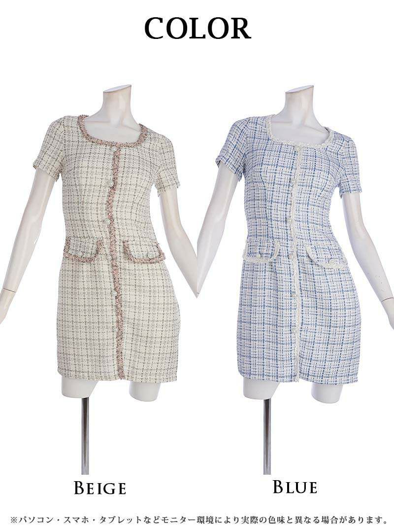 チェック柄の高級感ツイードワンピ チェック柄袖付きミニワンピース タイトキャバワンピ 同伴ワンピ【Belsia】(S/M/L)(ベージュ/ブルー)