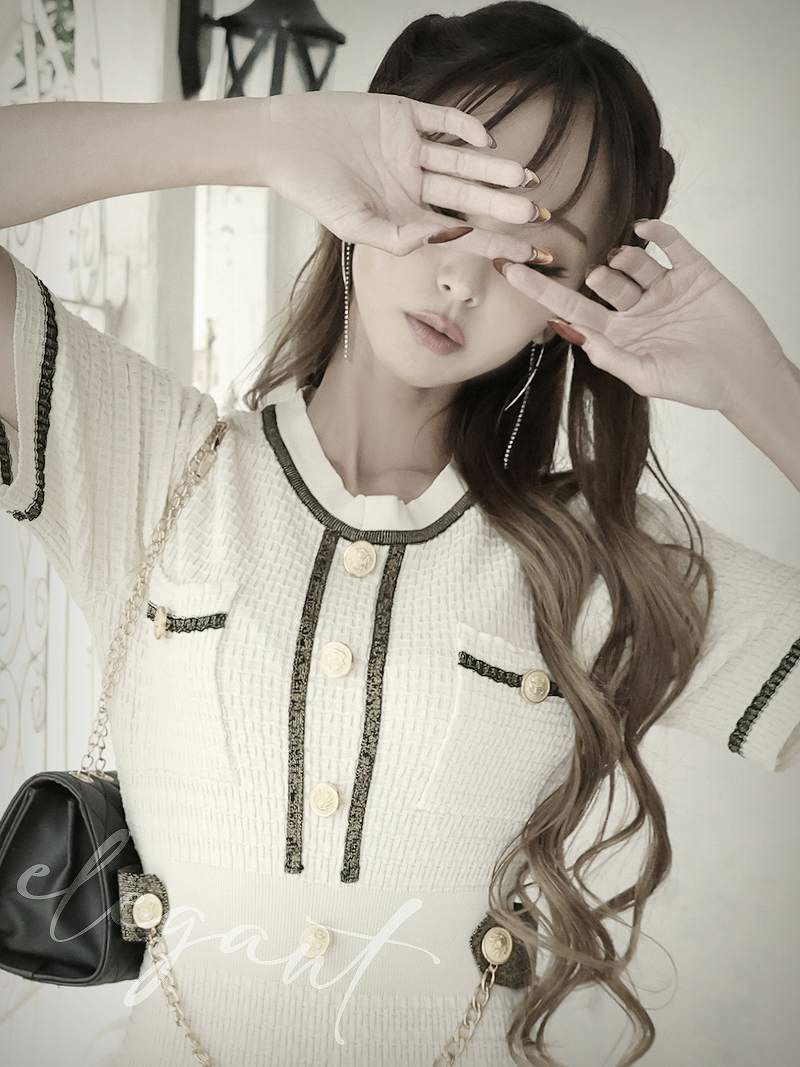 5. ワッフルニット五分袖キャバワンピ 武田静加 着用 チェーンパイピングキャバドレス【Belsia】(M)(アイボリー/ブラック/グリーン)