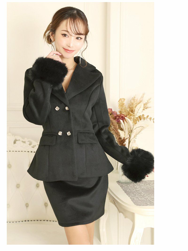 袖ファー付きフォーマルミニ丈レディーススーツ 武田静加 キャバスーツ【Belsia】