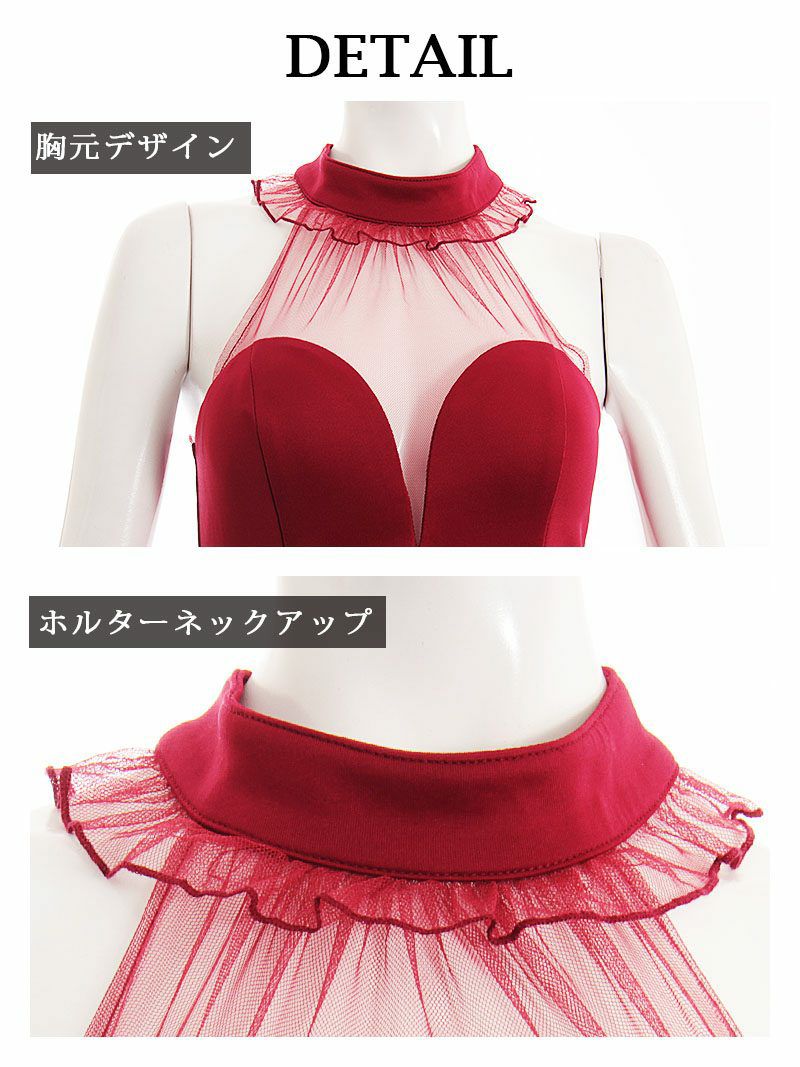 デコルテ部分のシースルーデザインから透ける谷間と背中がセクシーなシンプルでワンカラーなキャバドレス。
