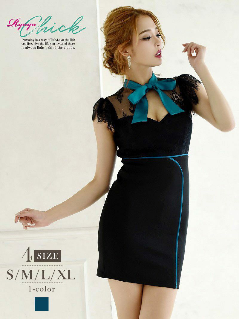 黒レースに差し色のビビットカラーが大人可愛い ネックリボンバストカットミニキャバドレス【RyuyuChick】(S/M/L/XL)(ブルー)