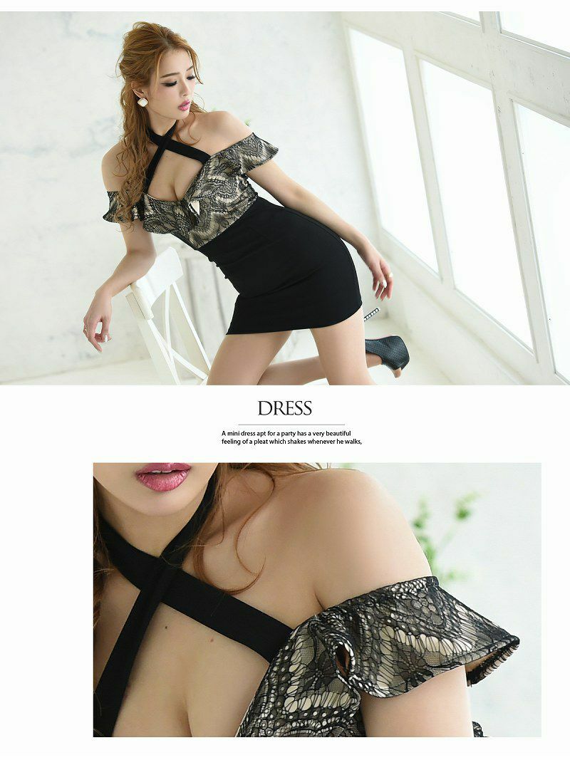 フリルや花柄レースが施され、オフショルダーとクロスネックで華やかさと上品さをプラス。
