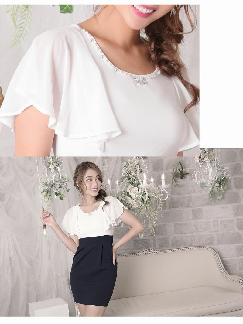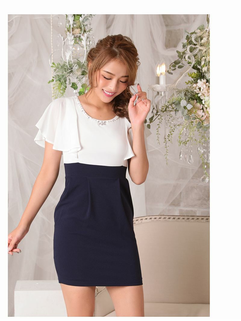 訳ありハイウエストが可愛い 【訳ありアウトレット】ふわフリル袖付キャバクラミニドレス【RyuyuChick】(S/M/L)(ネイビー)