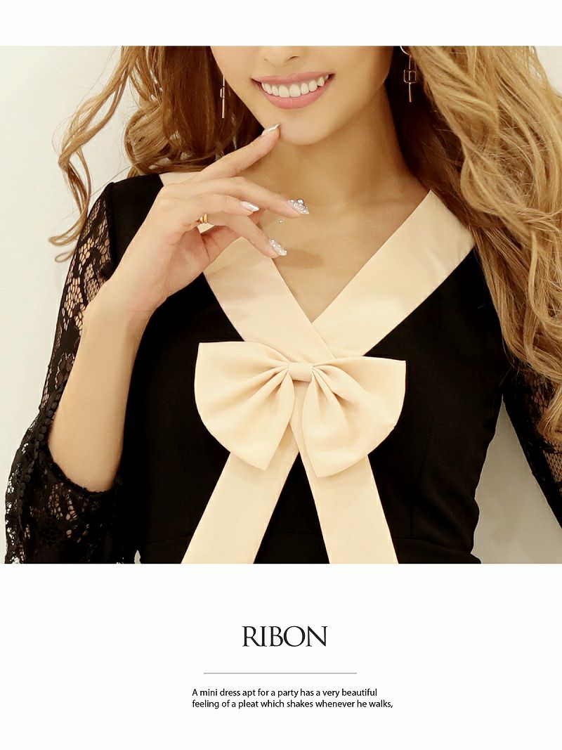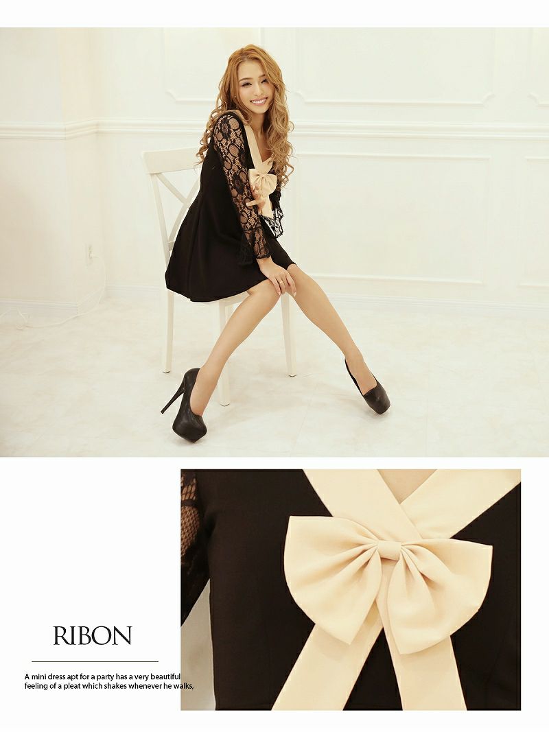 5. 【訳ありアウトレット】レース袖付きリボンミニキャバワンピース【RyuyuChick】(S/M/L/XL)(ブラック)
