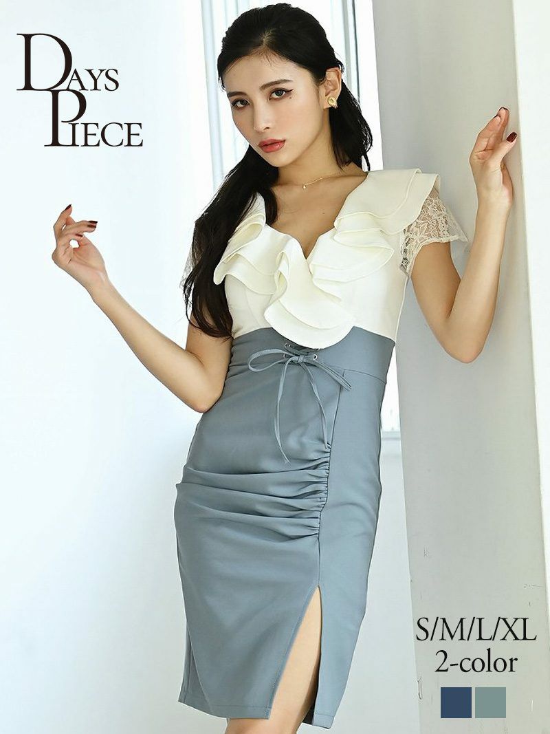 大きいサイズ完備!XLサイズ追加しました ラッフルフリルレース袖ウエストスピンドルキャバドレス【DAYS PIECE】(S/M/L/XL)(ターコイズ/ブルー)