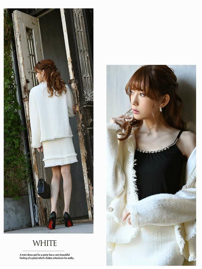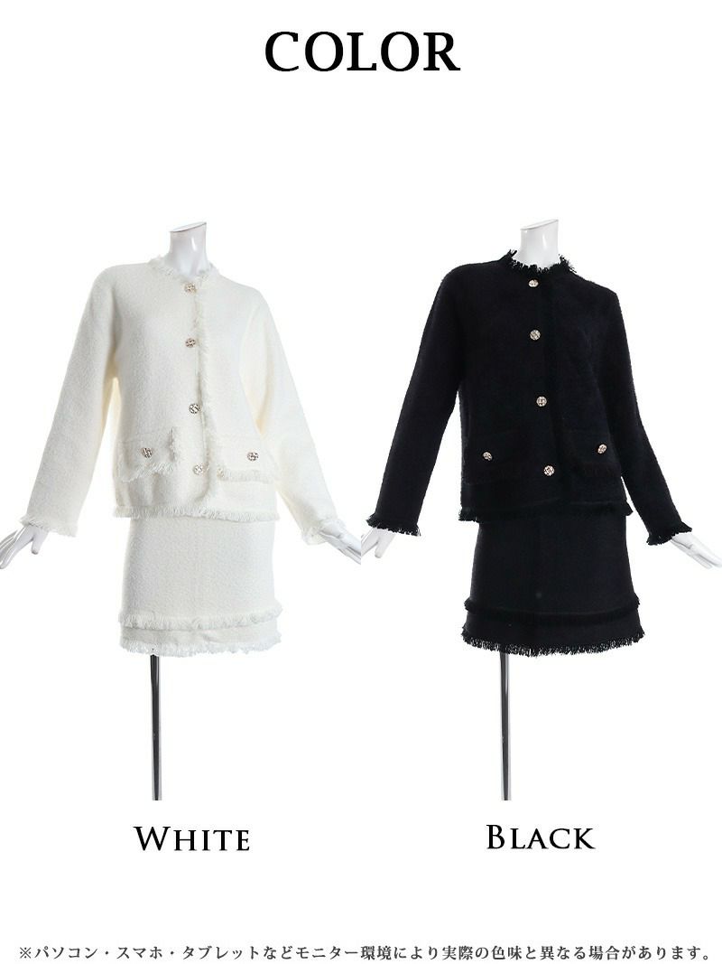 見た目も暖かく華やかに スーパーSALE¥10980→¥9881! モヘア調フリンジデザイン長袖ニットセットアップレディーススーツ 加賀美早紀 着用キャバスーツ【Belsia】(M)(ブラック/ホワイト)