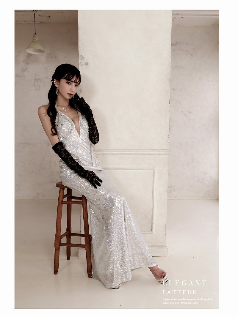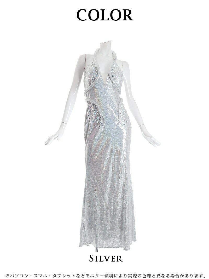 4. シルバーラメホルターネック谷間見せロングドレス 加賀美早紀 着用キャバドレス【BelsiaLUX】(S/M/L)(シルバー)