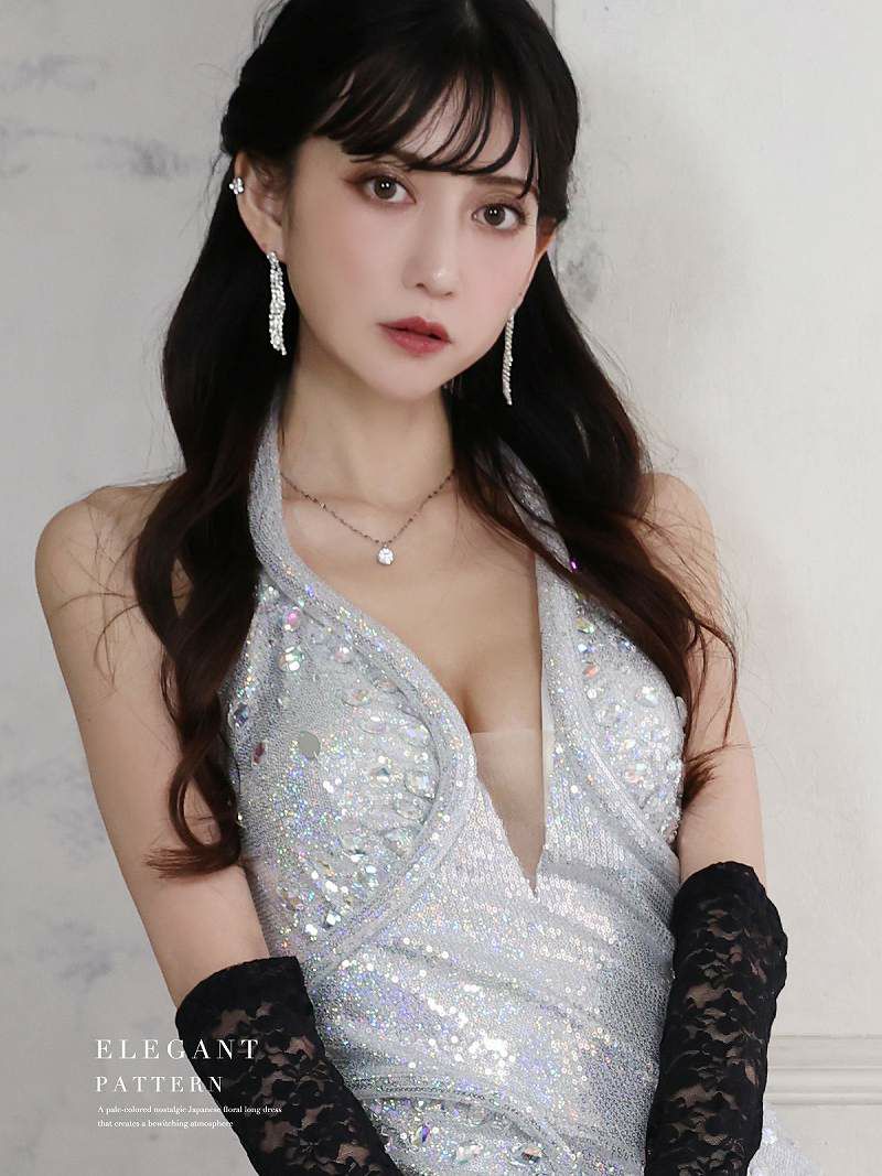 シルバーラメホルターネック谷間見せロングドレス 加賀美早紀 着用キャバドレス【BelsiaLUX】