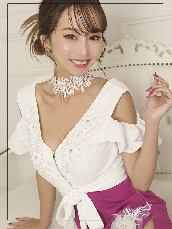 チョーカーがアクセなしでも顔周りに華やかさを演出してくれるキャバドレスになっています。